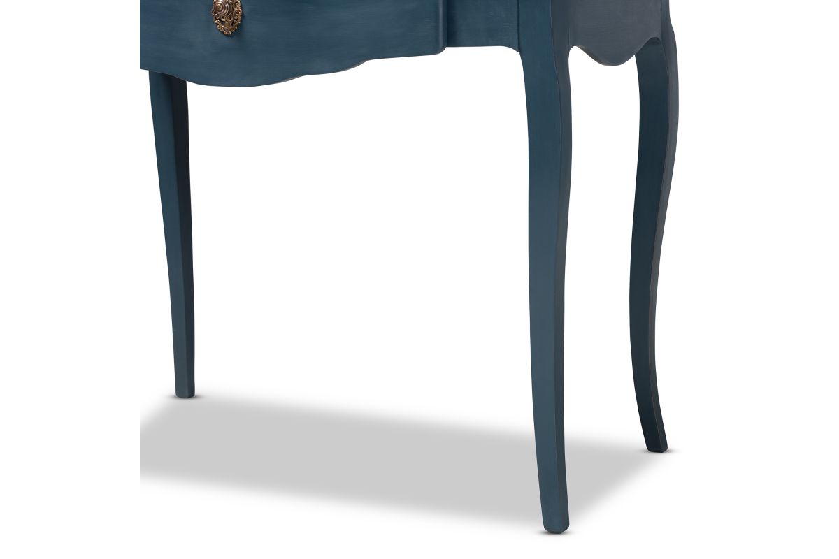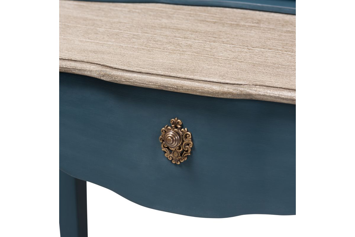 A classic French silhouette is combined with a rich blue finish to give the Hendrick writing desk a uniquely contemporary elegance. This stunning piece of furniture is crafted from bayur wood in a rich blue spruce finish that is complemented by the white-streaked natural veneer tabletop. Its traditional French inspired design features graceful saber legs and carved brass drawer knobs. Designed to add both beauty and function to your space, the Hendrick is fitted with ample storage capacity. One large drawer provides space to store folders and documents, while four smaller drawers and two shelves provide storage space for writing utensils and stationary. The Hendrick writing desk is made in Indonesia and requires assembly.