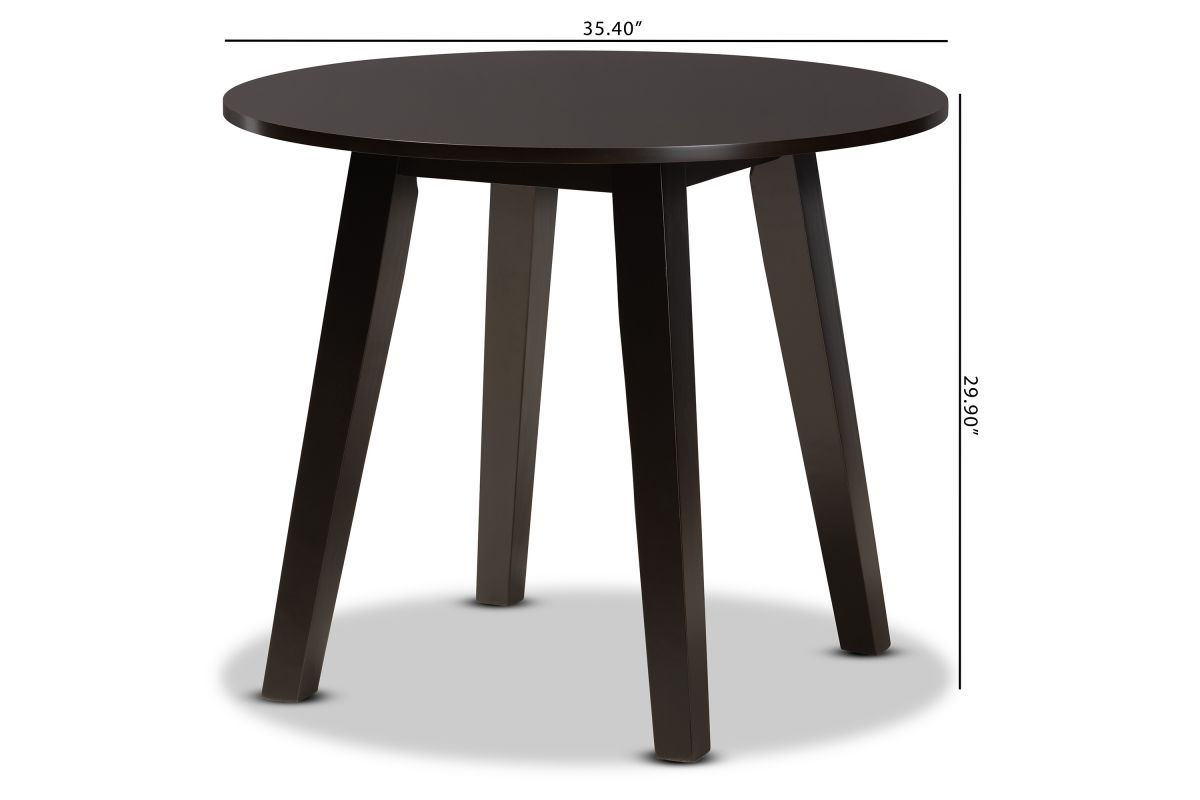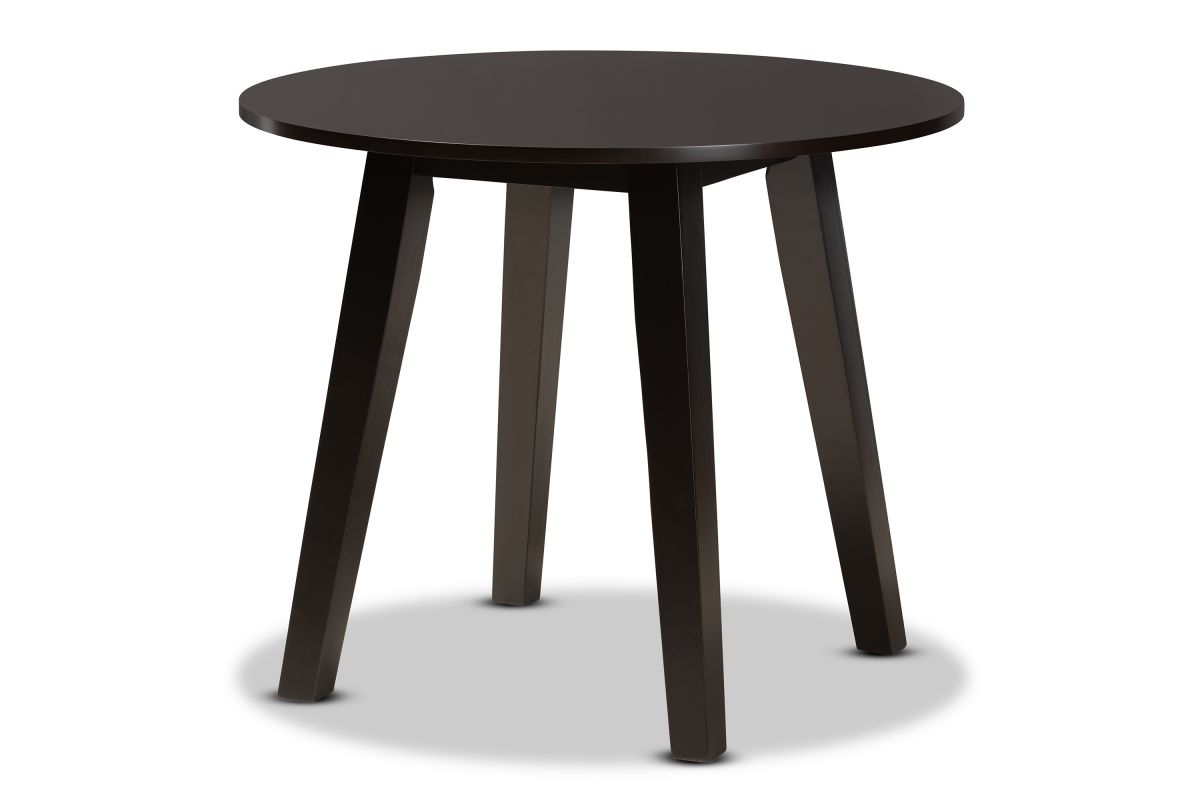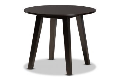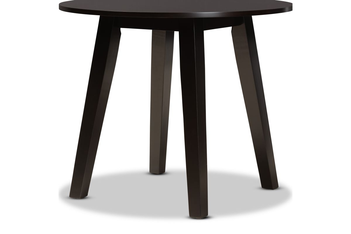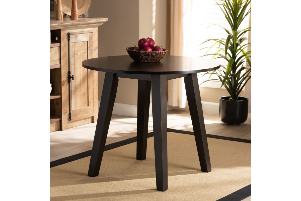 Featuring a modern profile and sleek finish, the Sunny dining table brings style to any dining space. Made in Malaysia, the Sunny is built from sturdy wood and comfortably seats up to four. A dark brown finish and round tabletop give the table a contemporary look while also providing ample elbow room for each member of the table. Splayed legs create a chic profile from any angle. Requiring assembly, the Sunny dining table is well suited for both casual and formal dining.