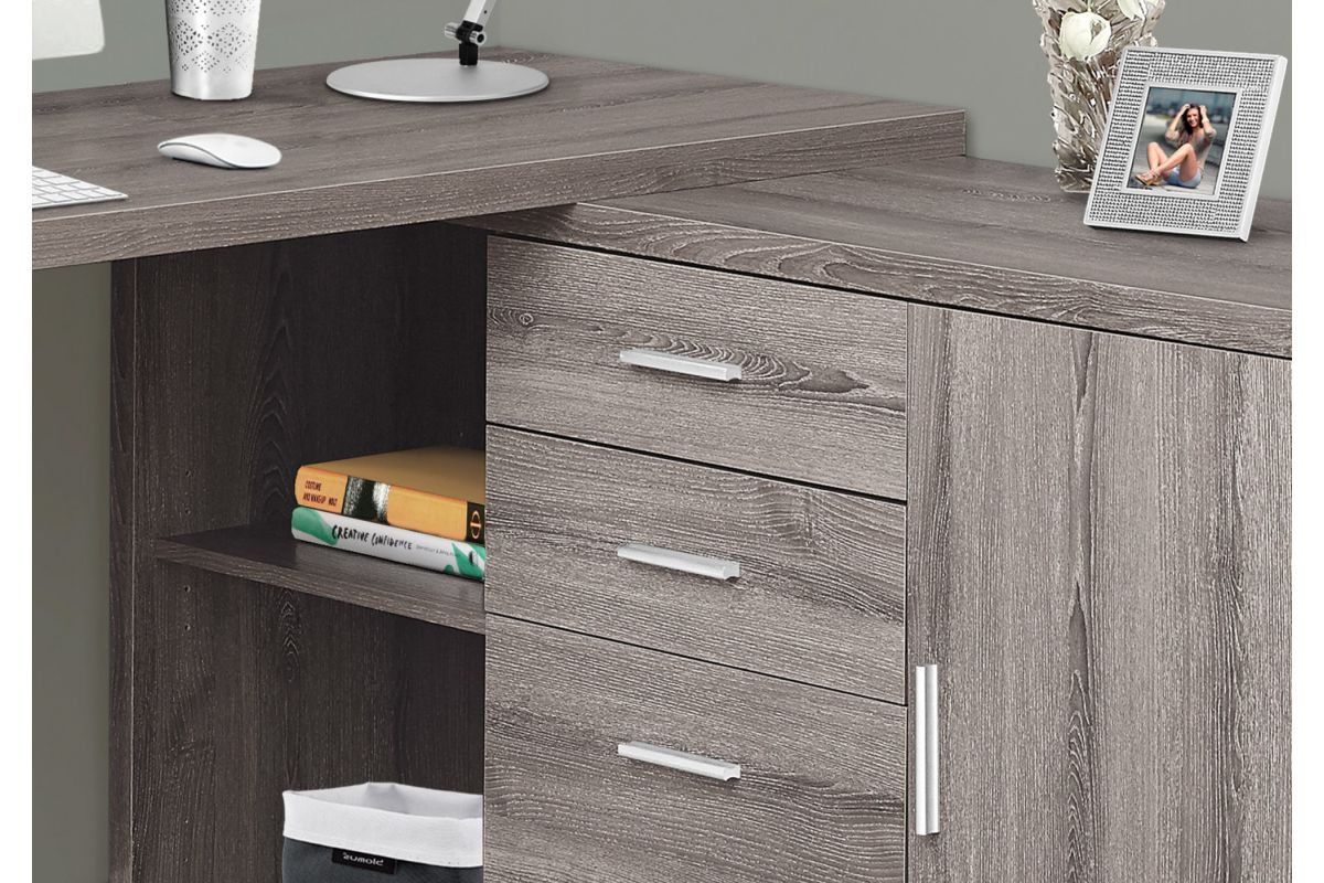 Choose how best to organize your workspace with this corner desk offering a reversible configuration and multiple storage options. This L-shaped desk in a dark taupe wood-look finish features a storage unit that can be installed on the left or right. It includes 2 cubbies with 1 adjustable shelf panel, 3 storage drawers in 2 sizes, and 1 cabinet with 1 adjustable shelf panel. The large, main desktop panel is supported by a robust, rectangular metal leg in a silver finish and overlaps the storage unit to create a second, lower worksurface. This L-shaped computer desk saves space when used in a corner but is finished on all sides for a polished look wherever it is placed in a home office.