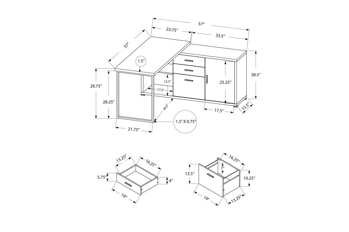 - Assembly required: Illustrated instructions and all hardware are provided for convenience (additional tools may be needed); this corner desk measures 57 inches L x 57 inches W x 29.75 inches H