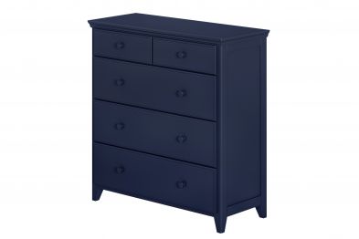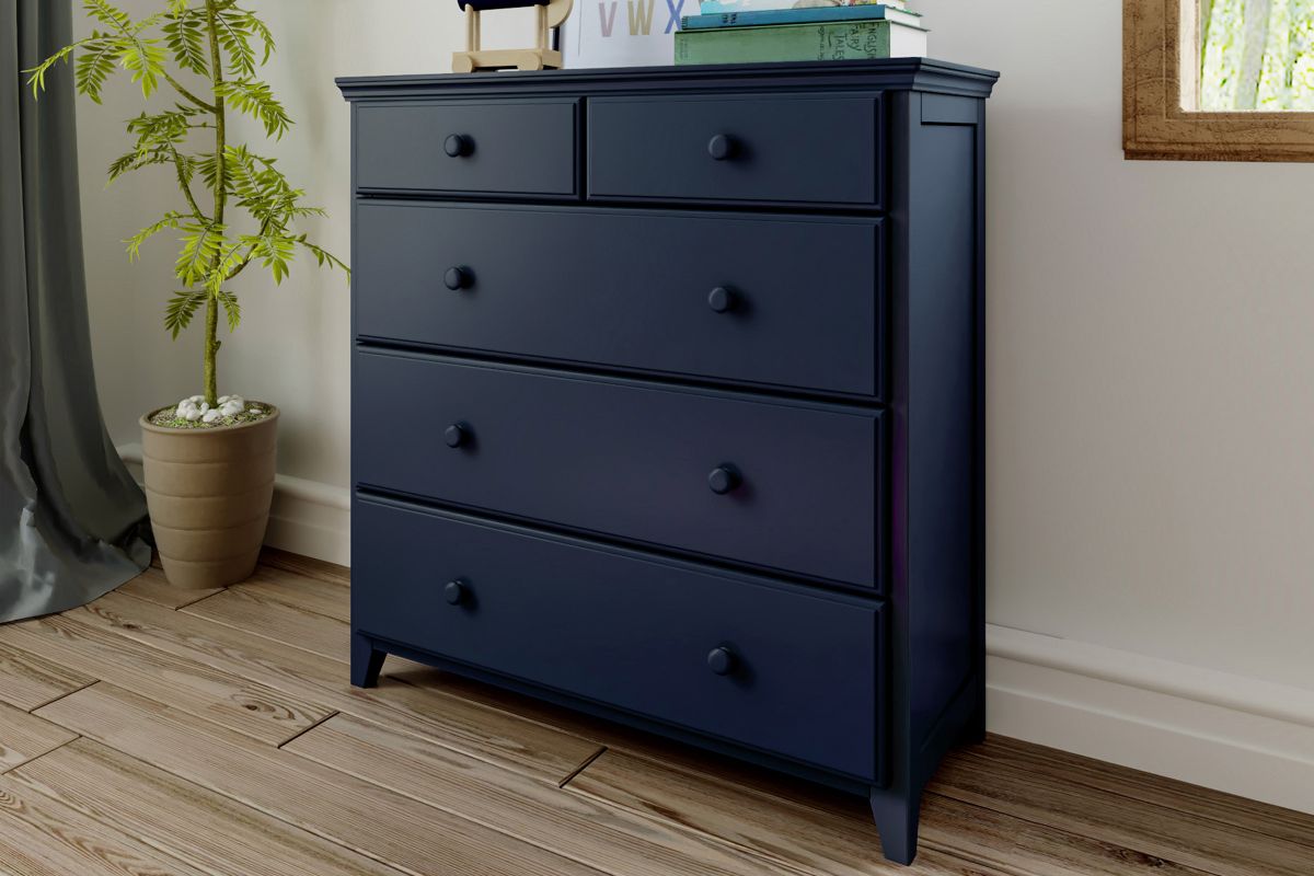 The Charlie Blue 5 Drawer Chest features a solid hardwood consruction. With a reinforced drawer bottom and metal drawer glide, this chest is built sturdy. The wood detail offers a classic and clean look that can transition past a youth bedroom.