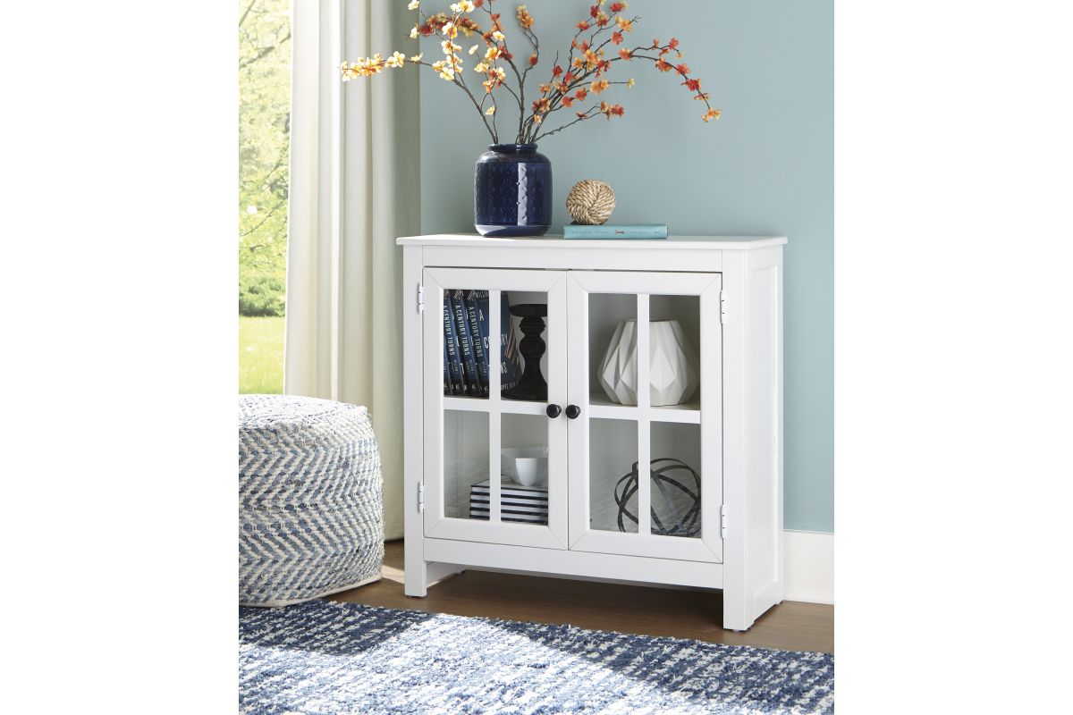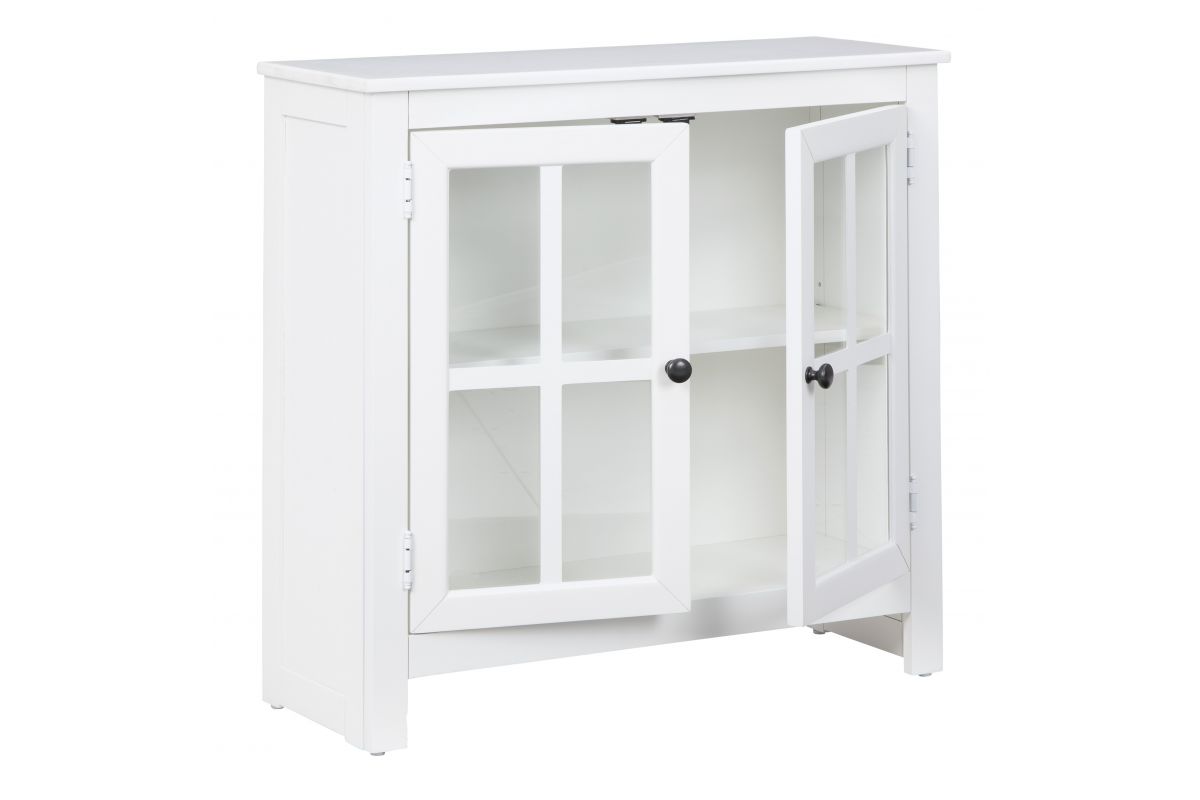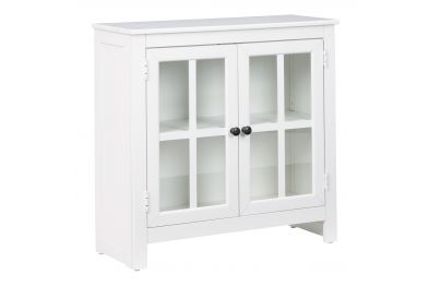 Function and style merge perfectly with this accent cabinet. Constructed of wood in a white finish, the accent cabinet adds an elegant touch to any room. Two doors and an adjustable shelf make for multiple storage solutions. Black finished metal door pulls add a finishing touch and a lattice door front with clear inset glass allows you to show off what you store.