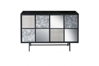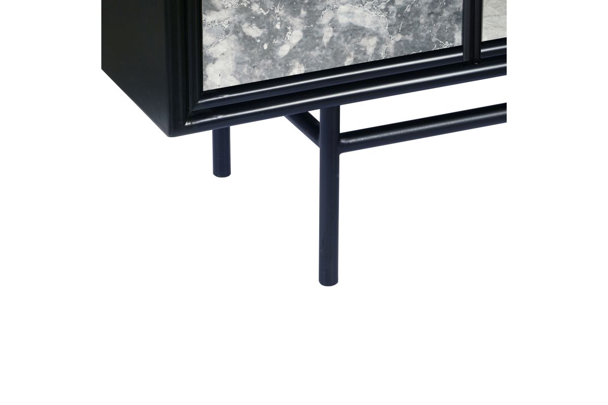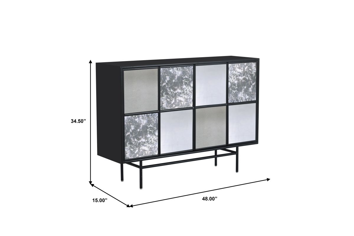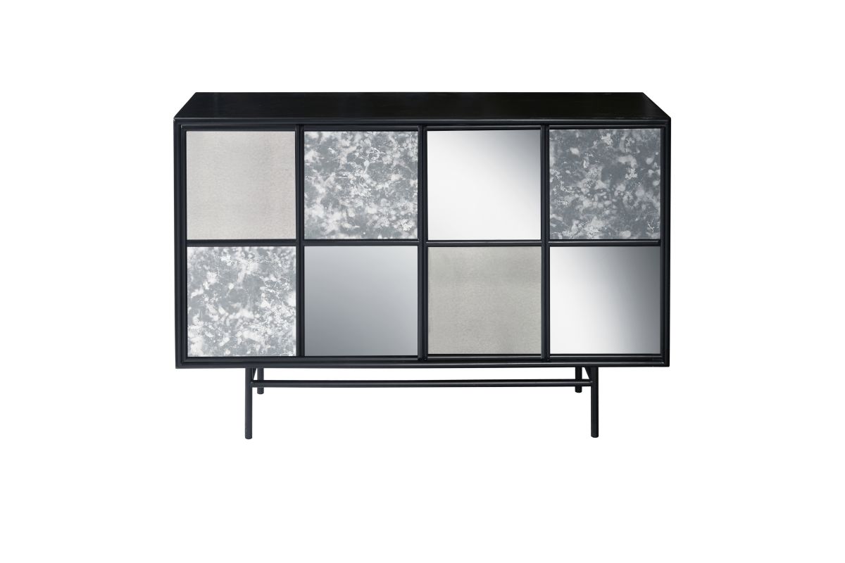 Complete your space with this Mirror Panel Four Door Console. The reflective panels will give the appearance of extra room framed with black metal which contiues down to the matching legs.