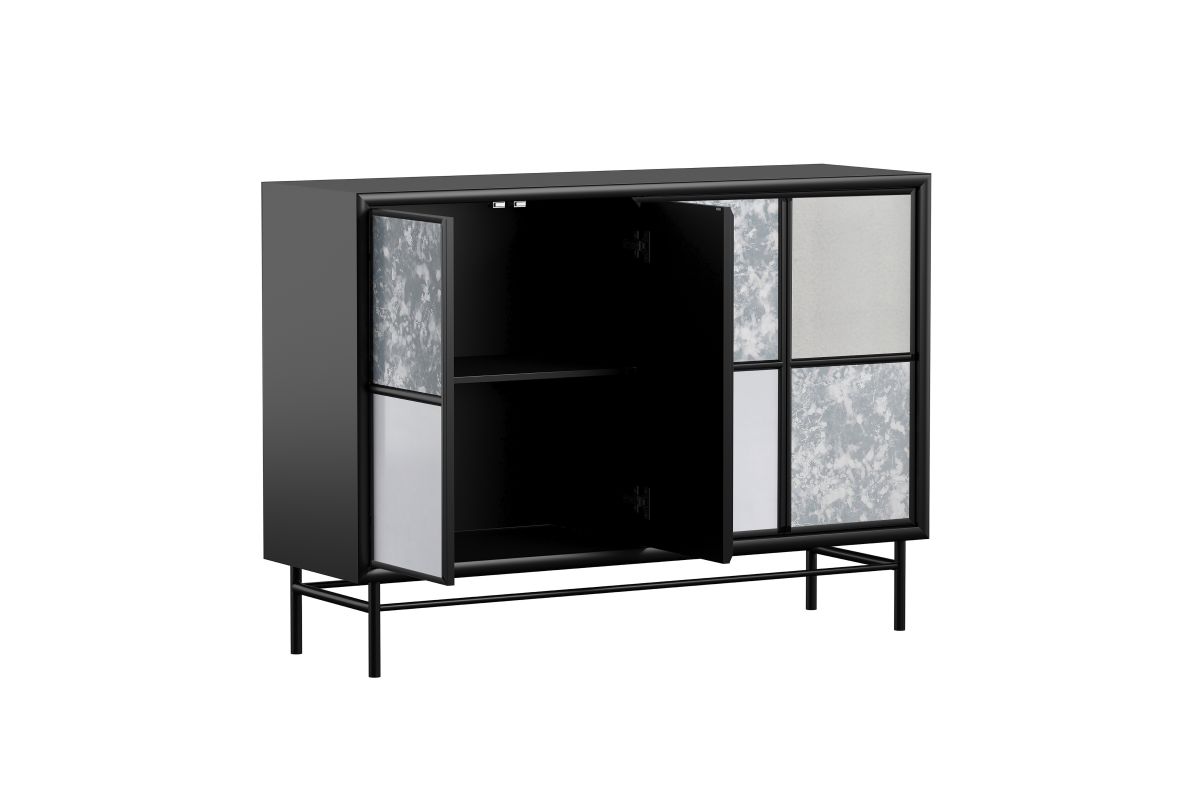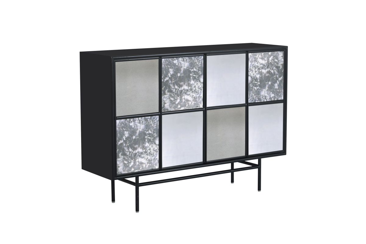 - Complete your space with this Mirror Panel Four Door Console. The reflective panels will give the appearance of extra room framed with black metal which contiues down to the matching legs.