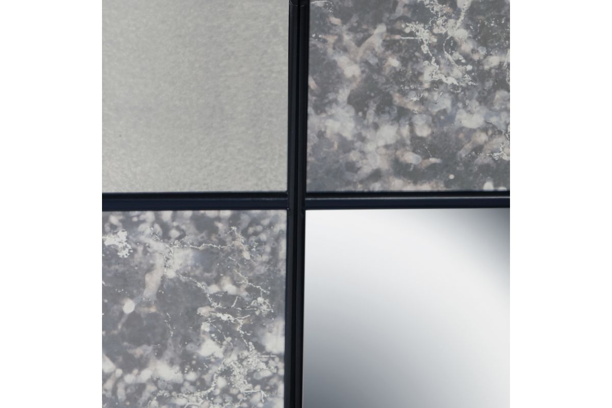 - The mirror panels are framed with black metal and showcase a complimentary alternating pattern.