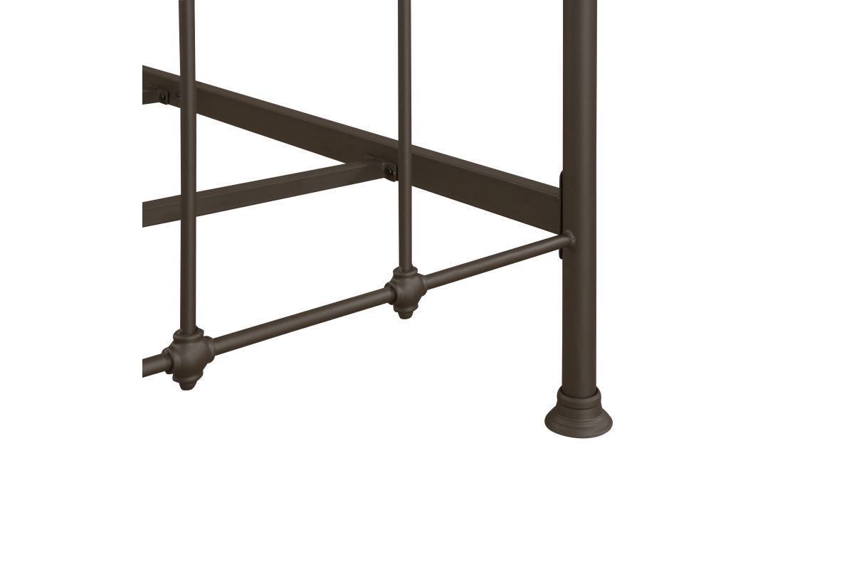 • Delicate spires and unique pass-through finial accents create headboard and footboard silhouettes that are both substantial and airy. The aged appearance comes courtesy of a brown powder-coated finish for years of durable performance. The flared end caps on the legs deliver stability, and three adjustable side rail heights allow you to customize the look of your finished bed. Simply add a mattress and box spring to the footed metal slats and enjoy a modern twist on old-fashioned charm each time you dream.
