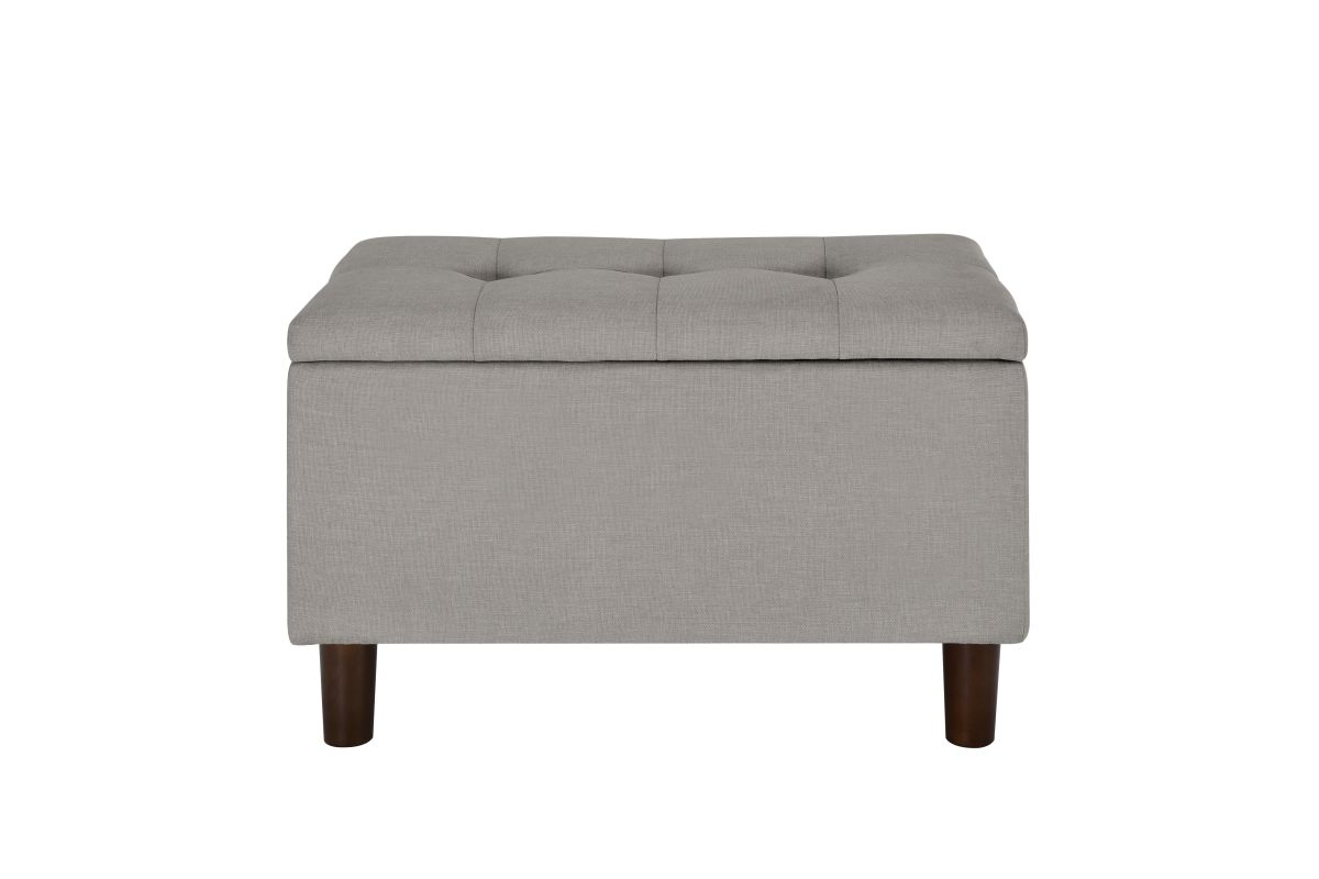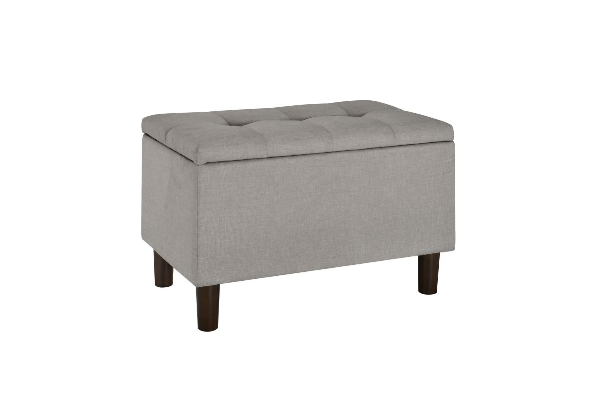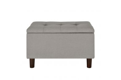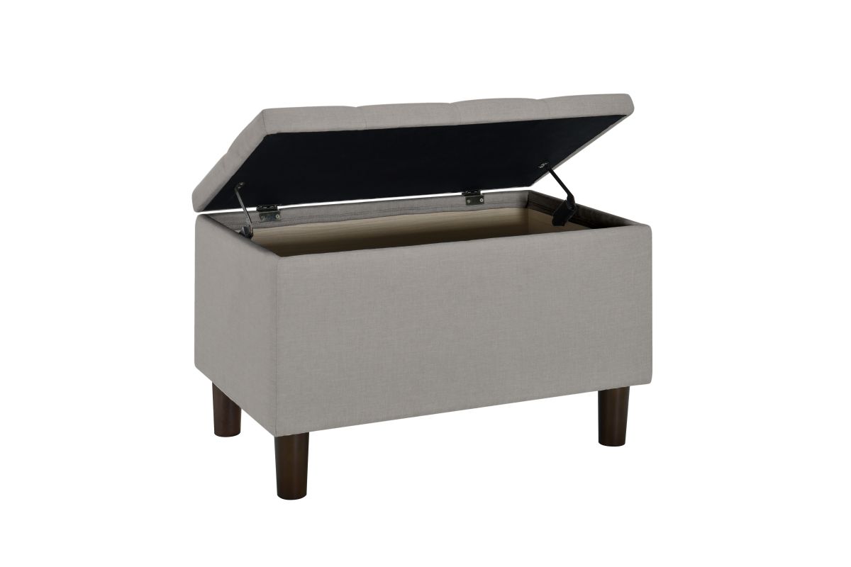 - Versatile and fuctional, this storage bench offers an understated traditional elegence to any space in your home. With a padded, tufted seat and hinged lid revealing ample storage space, this bench works great at the end of the bed or anywhere that extra seating and/or storage is needed. Upholstered in clean, soft fabric in neutral tones, this is the ideal piece for many different home décor styles. Constructed with quality materials, supported with square tapered wood legs, and air holes in the bottom of the bench ensure air flow even if the lid is shut, this storage bench is one you'll want in every room.