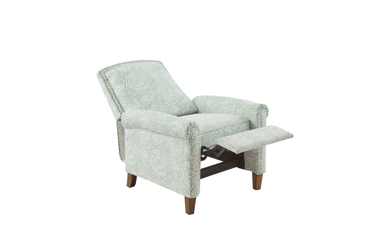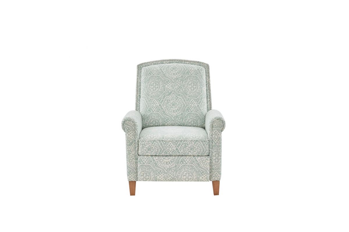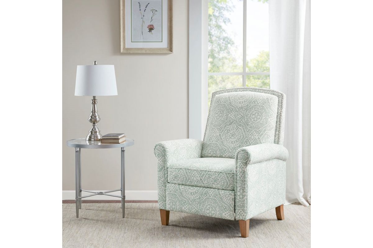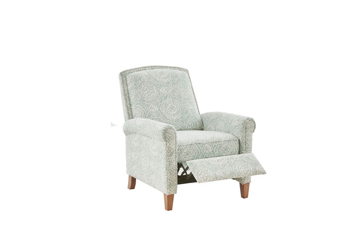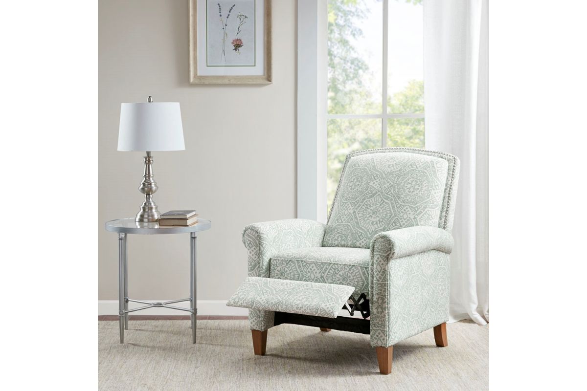The Madison Park Kirstin Push Back Recliner Offers An Elegant And Sophisticated Update To Your Living Room Decor. This Reclining Chair Is Upholstered In A Tonal Printed Fabric That Creates A Rich Transitional Look. The Pewter Nailhead Detailing And Rounded Arms Add The Perfect Touches To Elevate The Design. An Elm Wood Finish On The Solid Wood Legs Complements The Upholstery. With Its High Back, This Push Back Recliner Brings Comfort And Style To Your Home Decor.