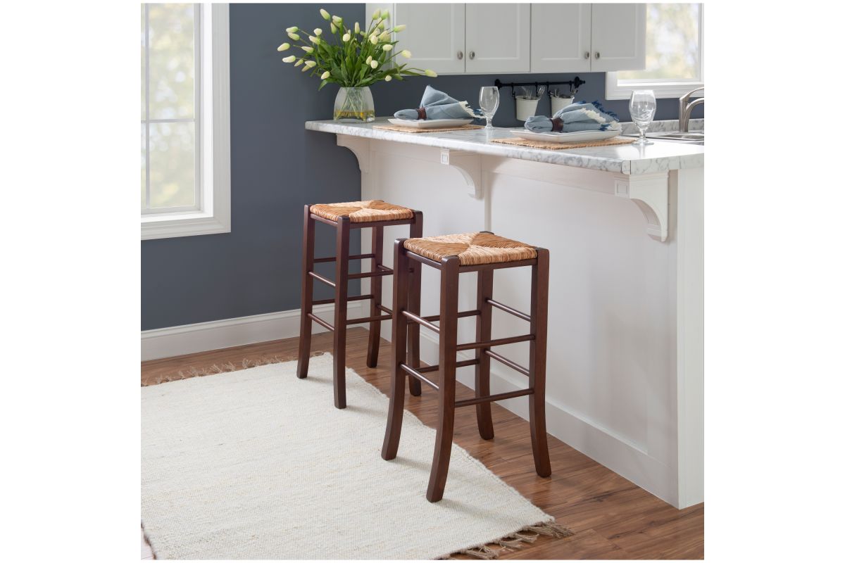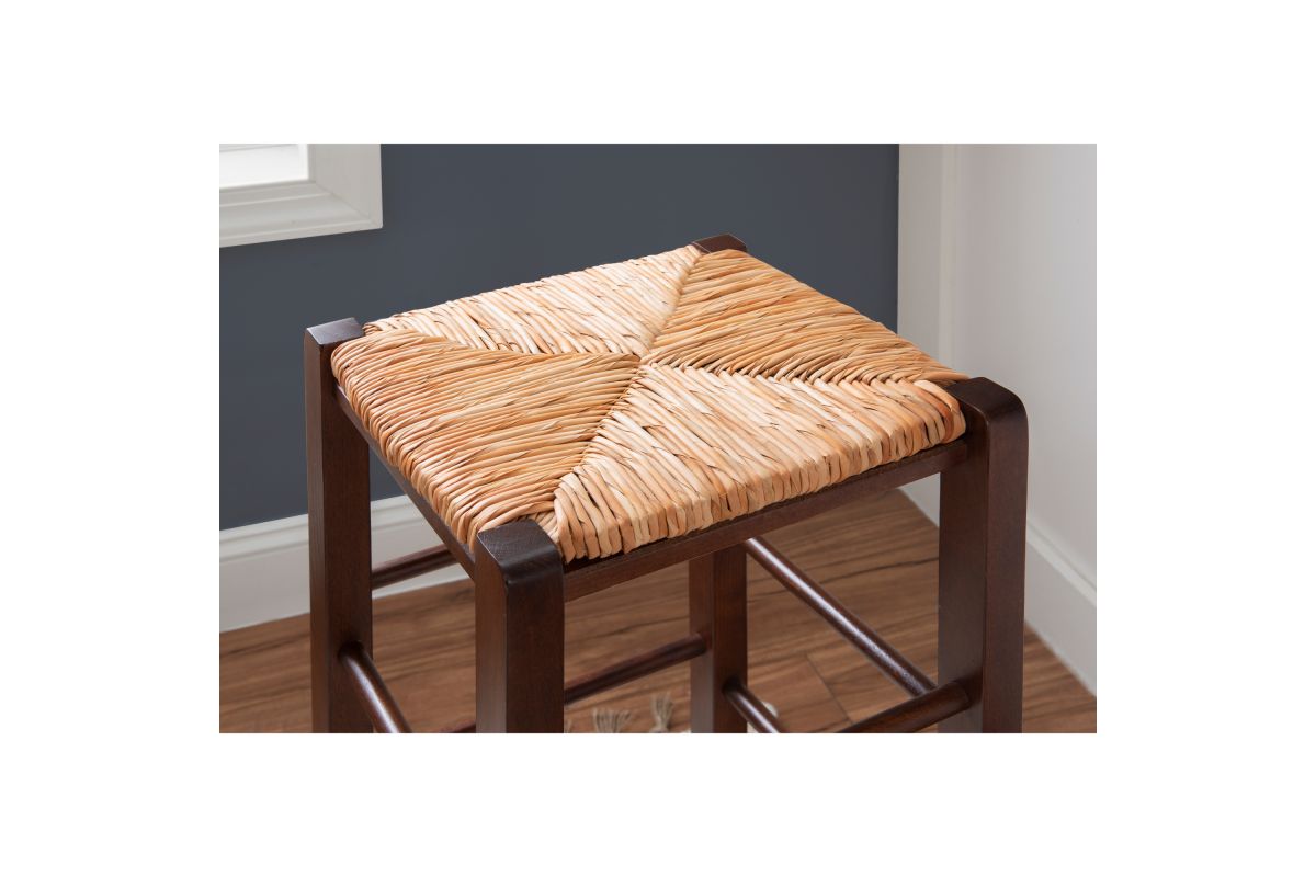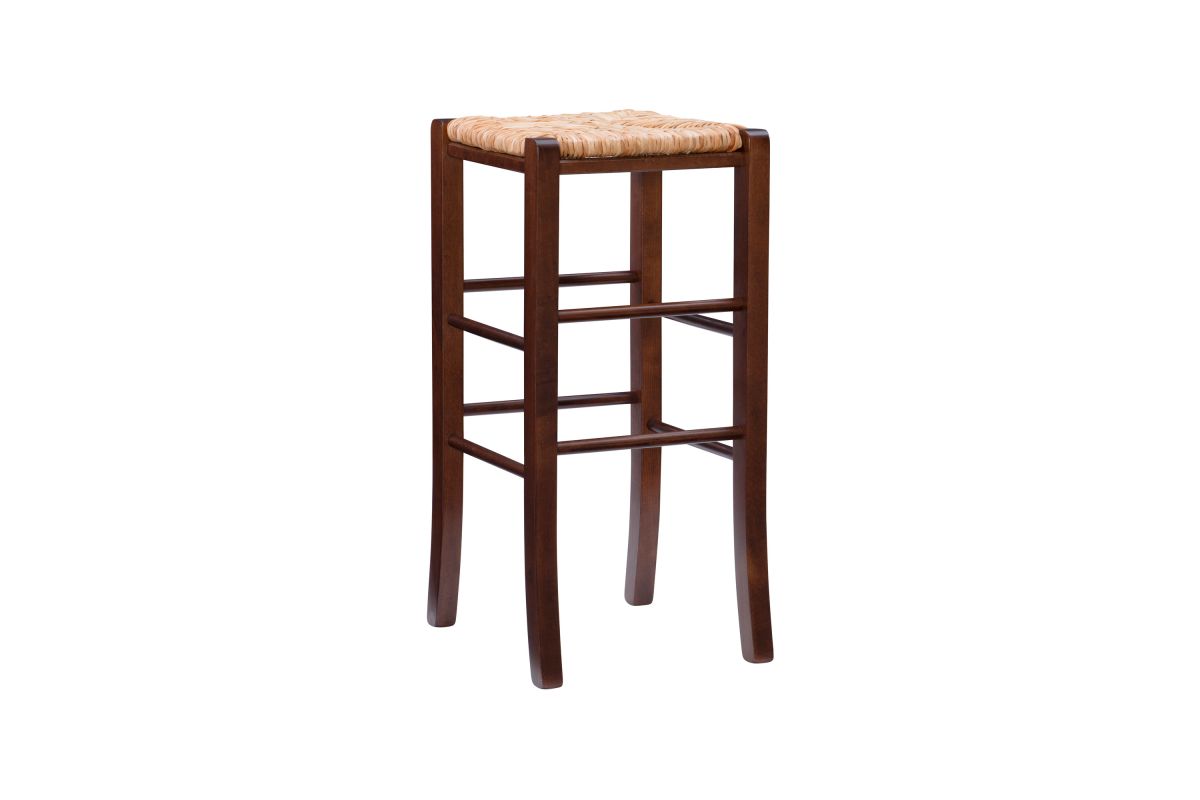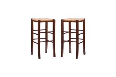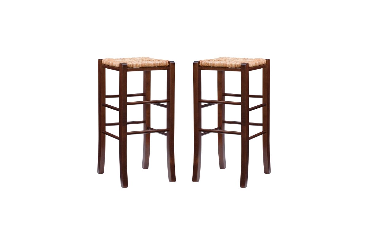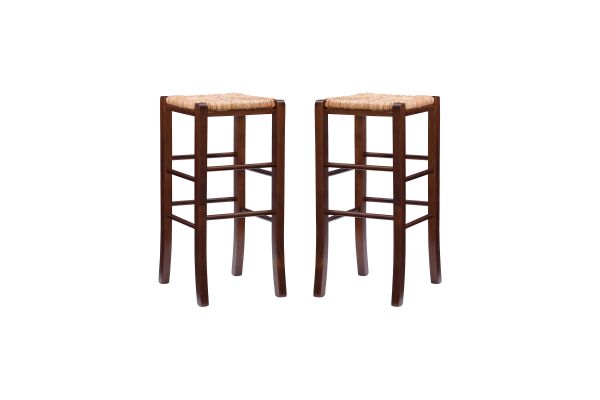 Modest and reliable, this classic bar stool is the unsung hero of countless family gatherings. The solid beechwood frame is stained in a warm walnut finish and is accompanied by handwoven rush seating as an ode to the countryside. Curved legs are supported by rungs that double as footrests for extra comfort and stability. With a backless design measuring just over 29" high, this European made stool can easily be tucked away under a bar or pulled out for extra seating. It arrives in a set of two.
