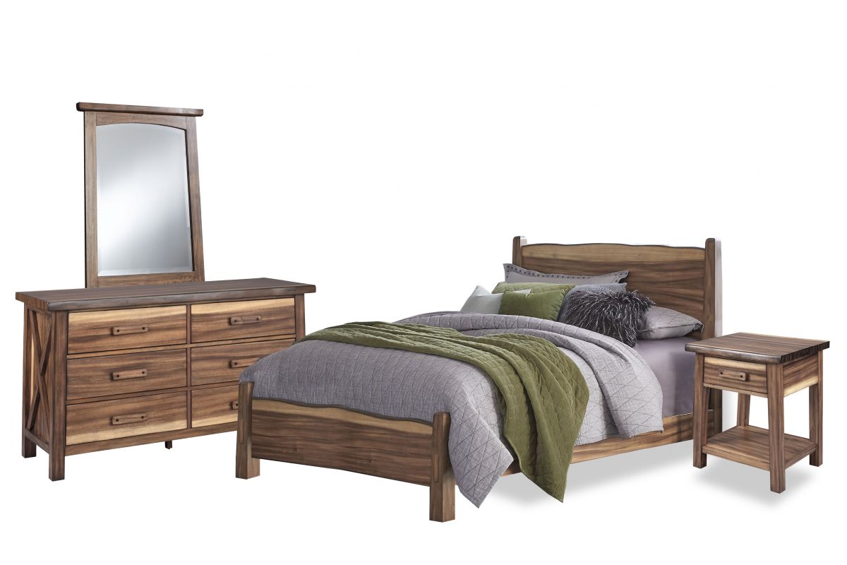 Inspired by the tropical rain forest, the Forest Retreat Queen Bed, Nightstand, Dresser and Mirror capture the alluring look of a live edge design for a natural-looking rugged elegance. Crafted from tropical grained wood veneers over engineered woods, each piece is finished with a natural teak look that provides the dramatic light to dark grain pattern. Simple yet striking, this combination complements a wide array of styles ranging from modern rustic to relaxed retreat. Part of a whole home solution, this bedroom set transforms your space into an inviting haven.