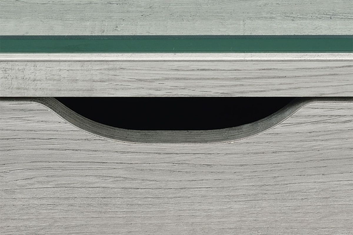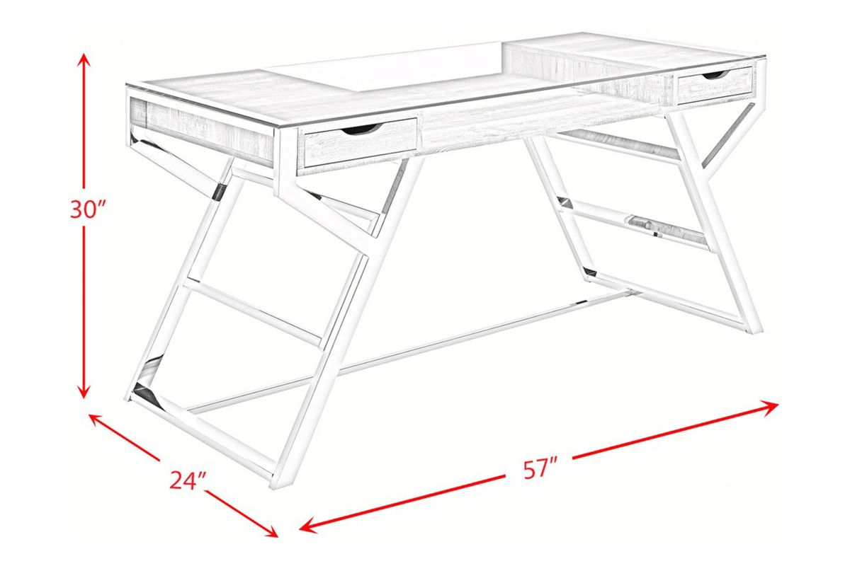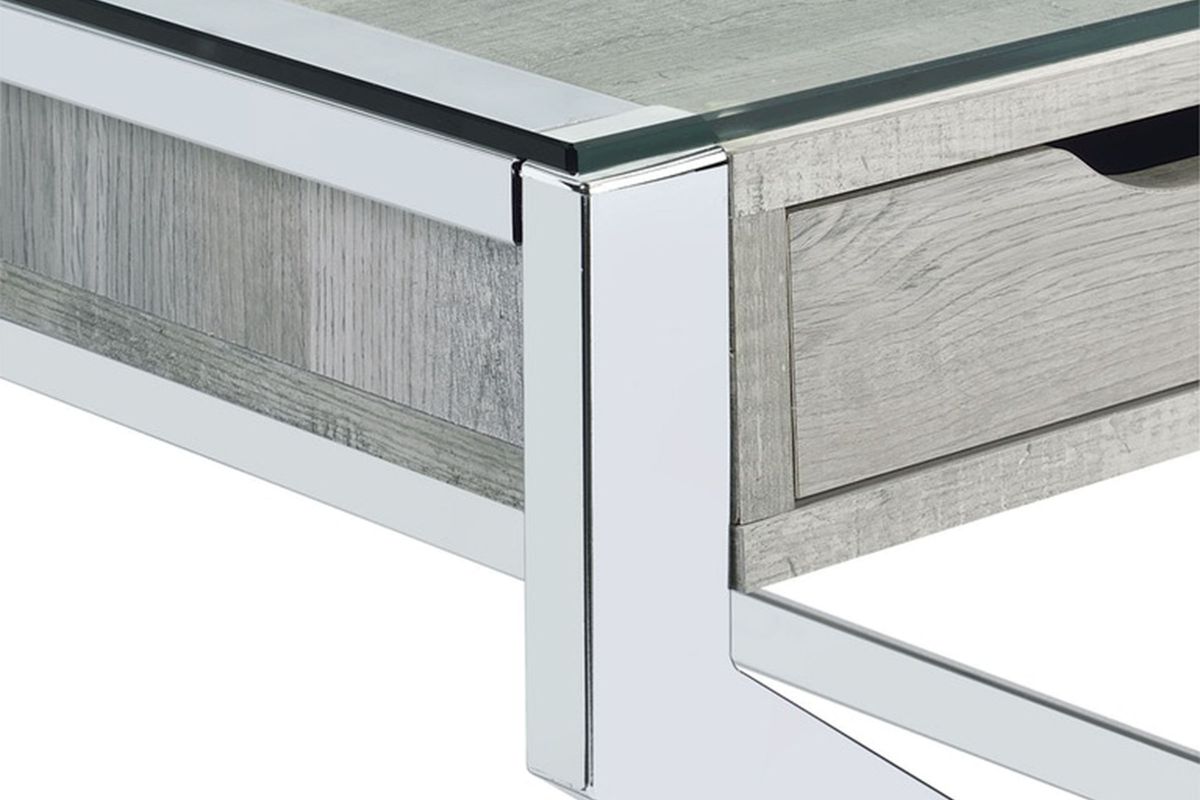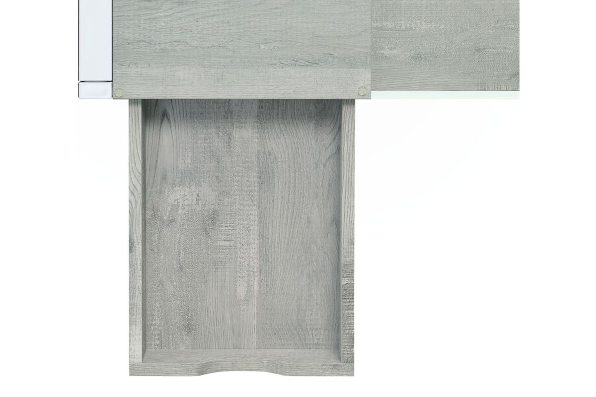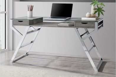 Inspired by modern designs, the Lovett Glass Top Desk features an airy design. Featuring a striking glass top and an industrial styled stainless steel base, the Lovett Glass Top Desk provides two levels of work and storage space. Finished in a grey distressed wood that contrasts seamlessly with the intricate silver base, your work space will exude style.