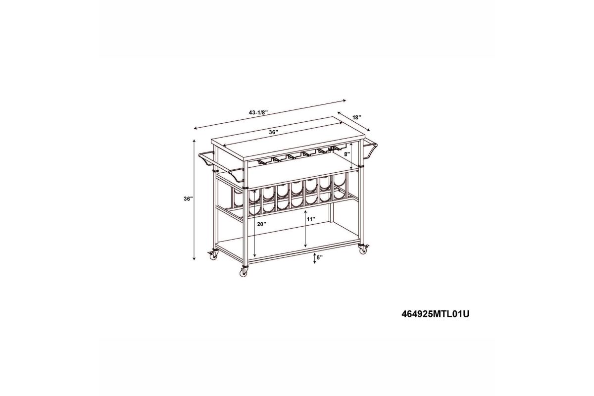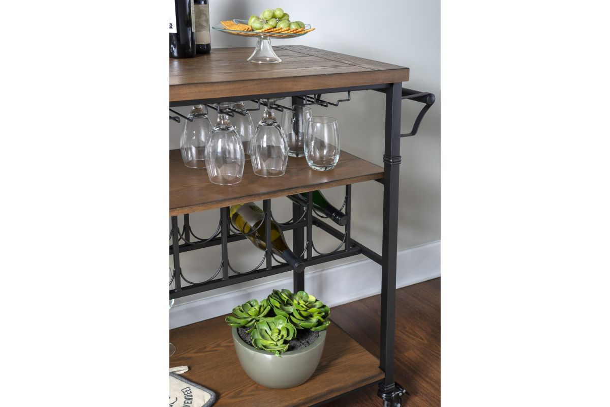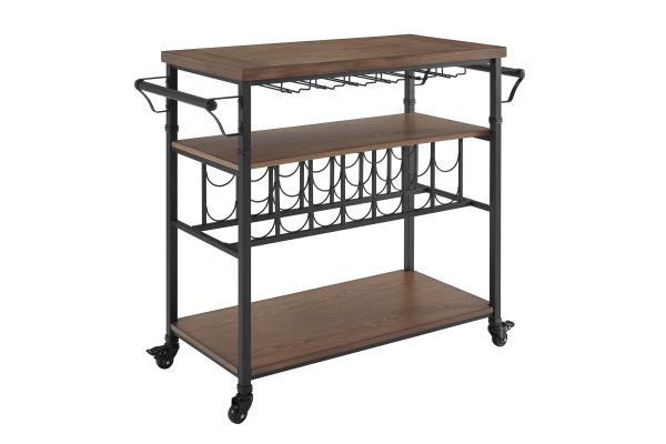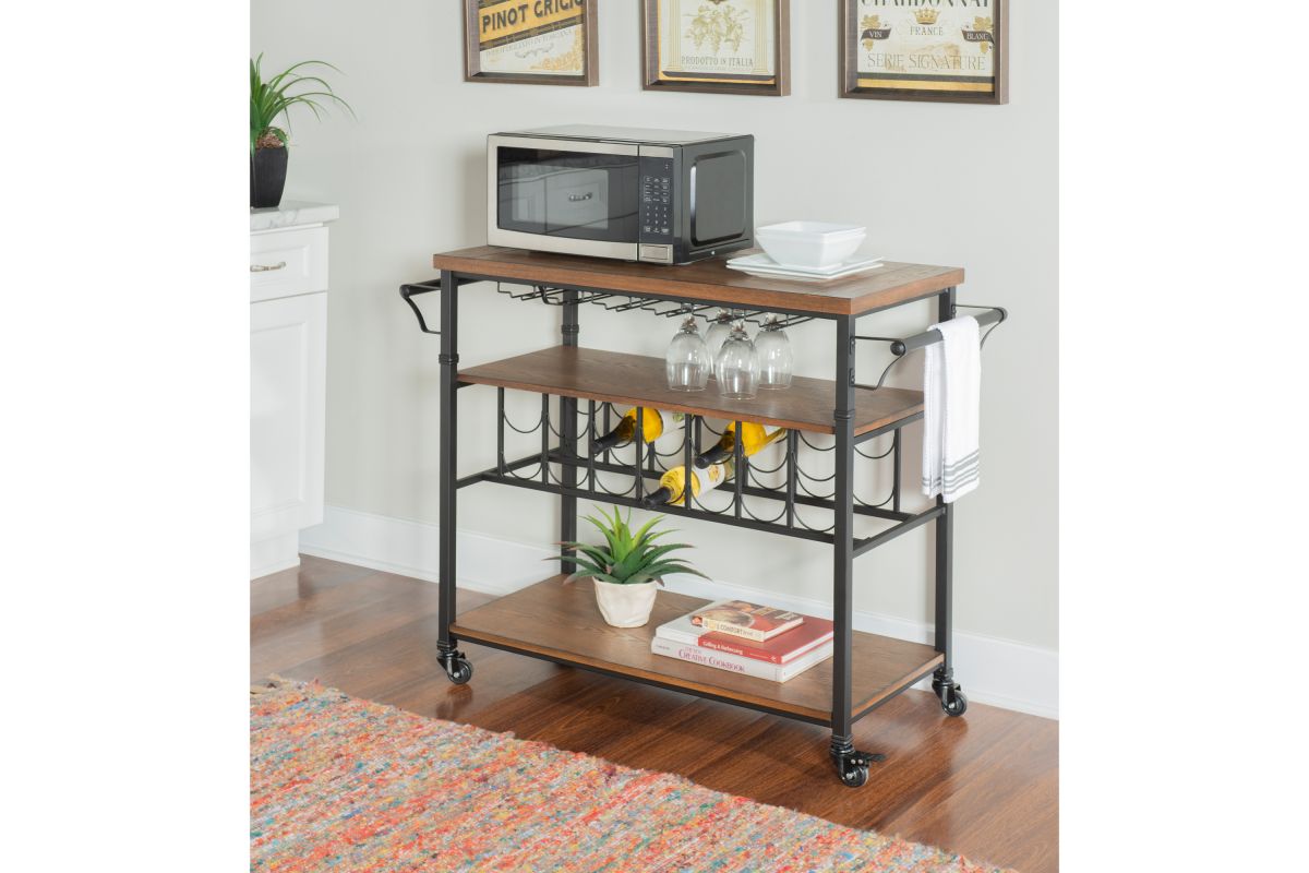 Set the stage for endless cocktail gatherings with the addition of this clever Wine Cart. Equal parts rustic and industrial, its open design adds a fresh touch to decor while wood planked detailing complements traditional and modern settings. Use the under rack to hang your favorite stemware and grab any wine choice from the spacious dual-level rack. The bottom storage shelf is perfectly sized to keep additional serveware nearby as you wheel this bar cart throughout the night between rooms. Can accommodate compact microwave ovens.