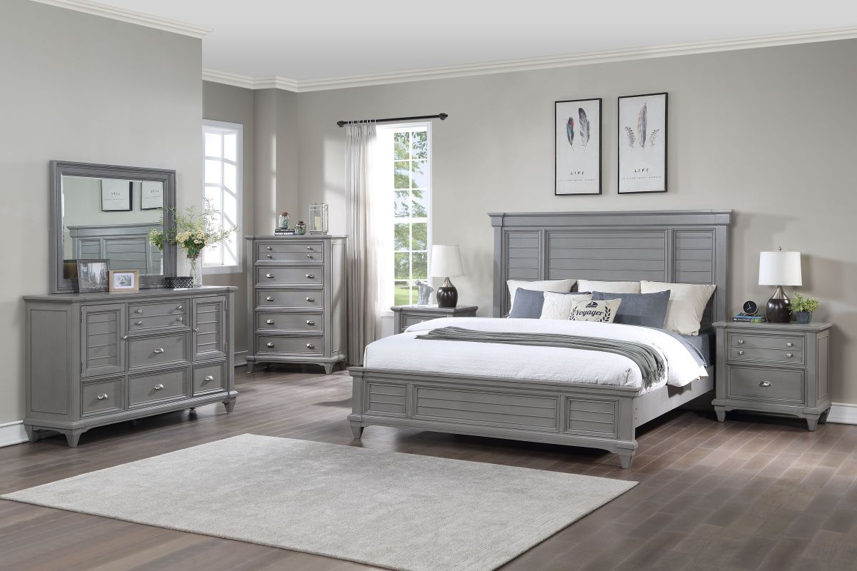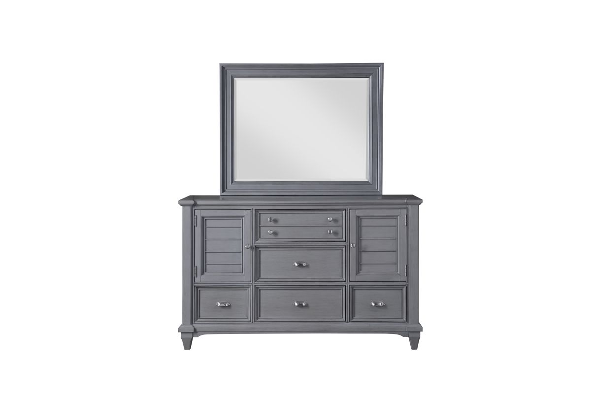 Cottage styling is the Bay Harbor dresser. With a chic gray finish, this piece has five spacious drawers for storage (the drawer on the top is one drawer made to look like two). All drawers are crafted using English and French dovetail construction for strength and stability. Each door has bead moulding for a shutter look and opens to reveal an adjustable shelf for folded clothing. Brushed nickel finished hardware adds the final touch.