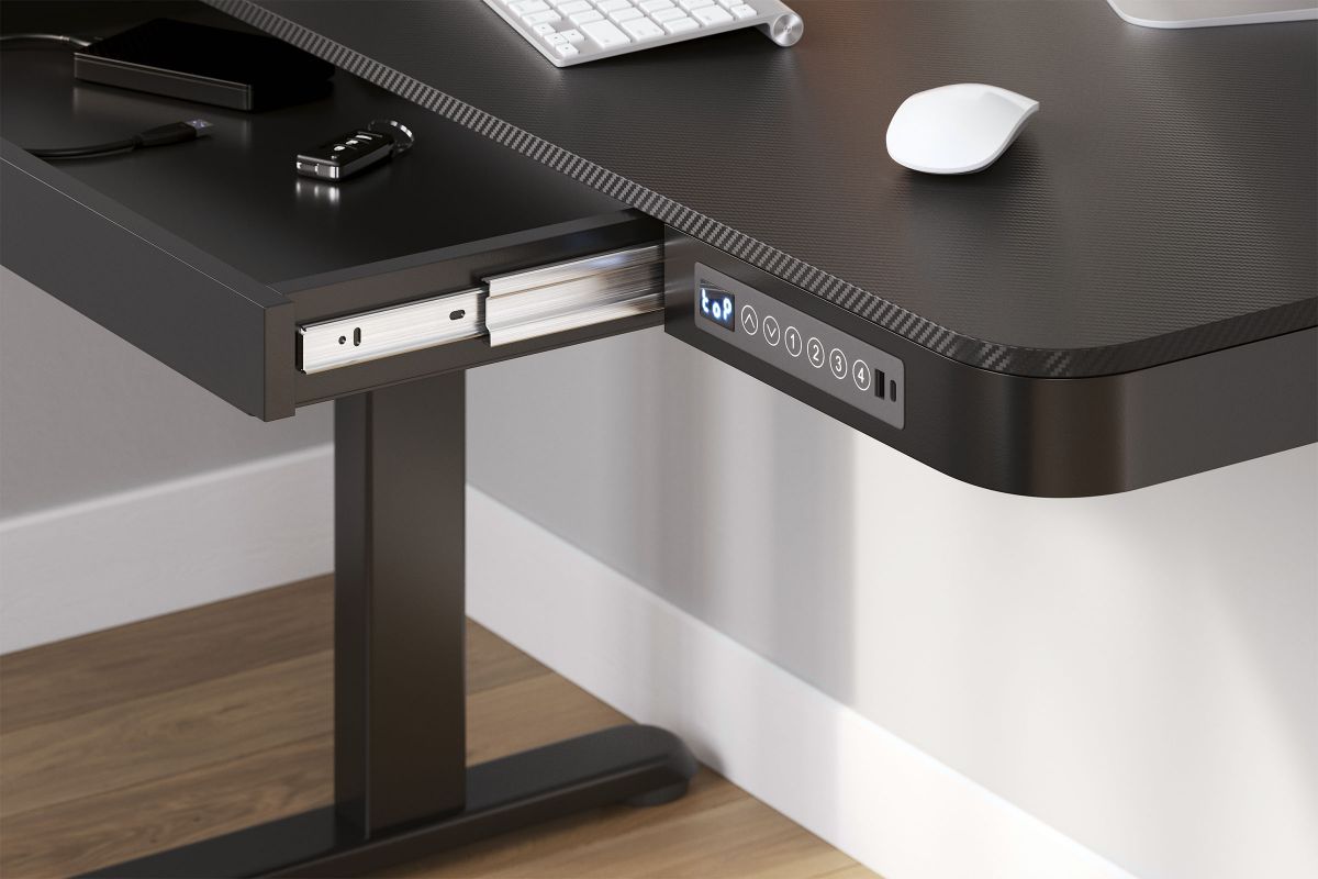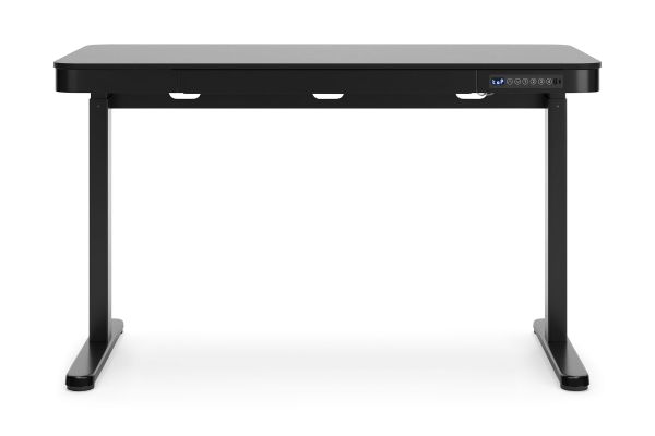 Work smarter (and look cool doing it) with the new-age efficiency of the Lynxtyn adjustable height home office desk. Its streamlined design is ideal for working from home, with a powered height adjustment feature enabling you to find your ultimate comfort position. The super-sleek black desk also includes two types of USB charging ports and a smooth-gliding drawer, so you can have elite form and function all in one.