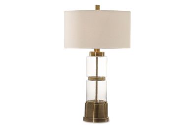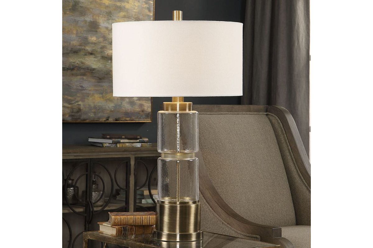 Stacked clear glass columns with a hammered texture, displayed with antique brass plated steel details. The round hardback drum shade is a white linen fabric with white slubbing.