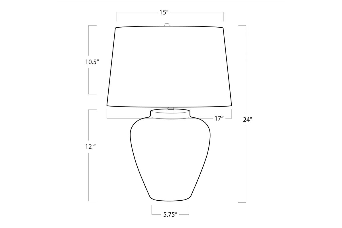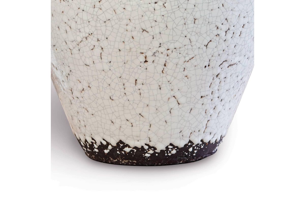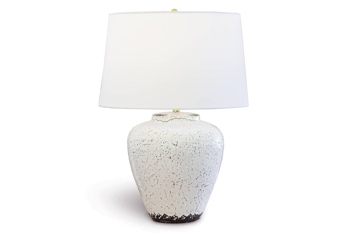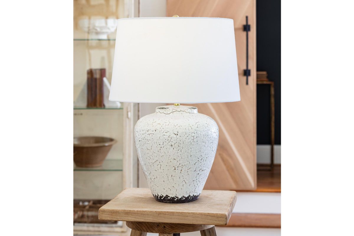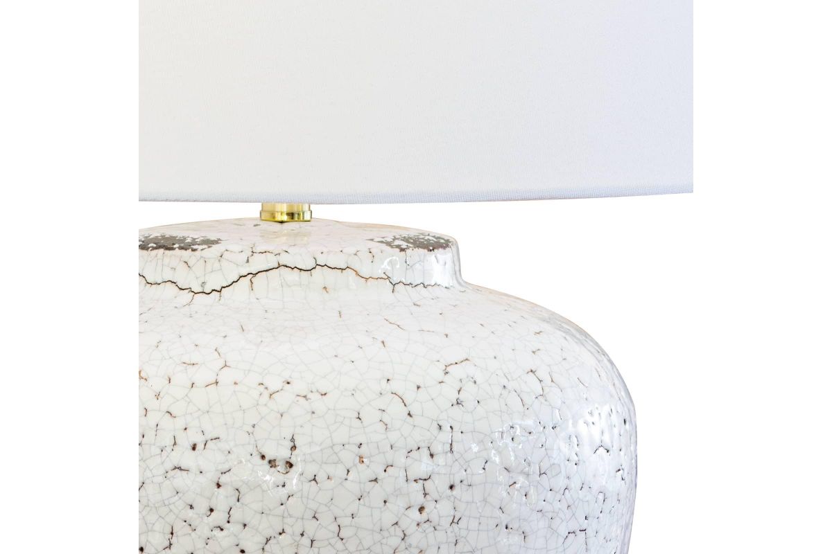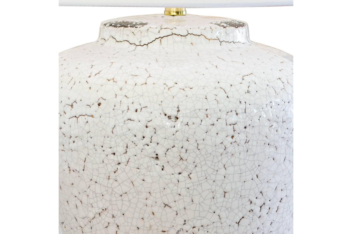 The white crackle ceramic glaze along with the exposed unfinished clay at the base of the Harper give this lamp its signature, hand-crafted, rustic appearance. The lamp's substantial base is finished with a large, slightly tapered, natural linen drum shade and natural brass finial. Place this lamp anywhere needing a bit of rustic charm, from the living room to the bedroom.