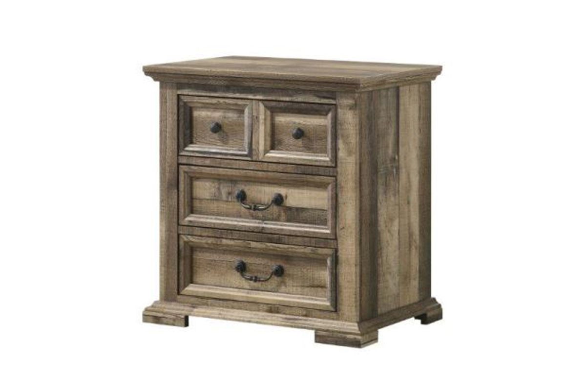 The Wyatt 3 Drawer Nightstand showcases the rustic plank style look with a rich grey stain for a warm, eco-conscious touch that works well with any bedroom set.
