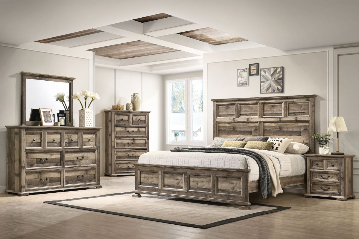 The Wyatt Bedroom Collection showcases the rustic plank style look with a rich grey stain for a warm, eco-conscious touch. .