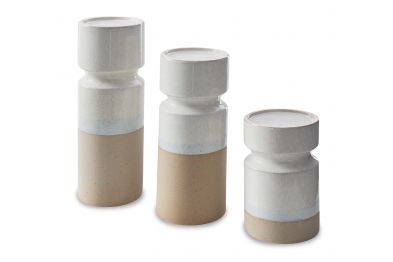 Exuding a sense of earthy elegance, this candle holder set is one tantalizing trio. The brown and gray glazed ceramic is a cool contrast to the pieces' clear glass rims. With their varying heights, these candle holders permeate just the right ambiance when displayed individually or in a group. They're finished with a reactive glaze technique admired for its variegated coloring so each is one of a kind. Due to the finishing process of this product, some variations may occur.