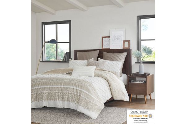 Transform you bedroom with the charming shabby chic allure of the INK+IVY Mila 3 Piece Cotton Comforter Set with Chenille Tufting. The cotton comforter flaunts an updated taupe botanic print, on a natural white ground, with tufted white chenille, in a chevron design, to create a charming farmhouse look. A solid taupe reverse complements the top of the comforter, while hidden bartacking secures the hypoallergenic polyester filling without visible line for a clean finish. Two matching shams beautifully mimic the design of the comforter, completing the farmhouse comforter set. Machine washable, this cotton tufted comforter set offers soft comfort and a vivid touch that elevates your bedroom decor. This comforter is OEKO-TEX certified, meaning it does not contain any harmful substances or chemicals to ensure quality comfort and wellness.