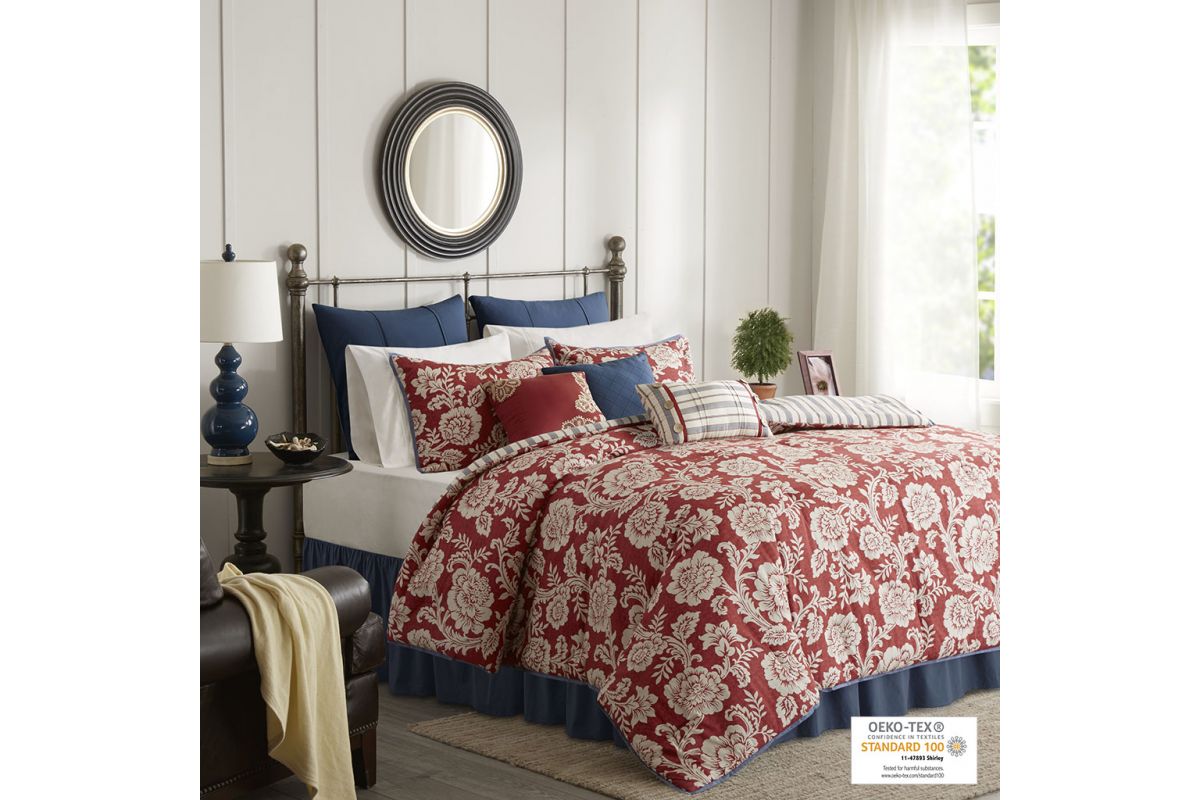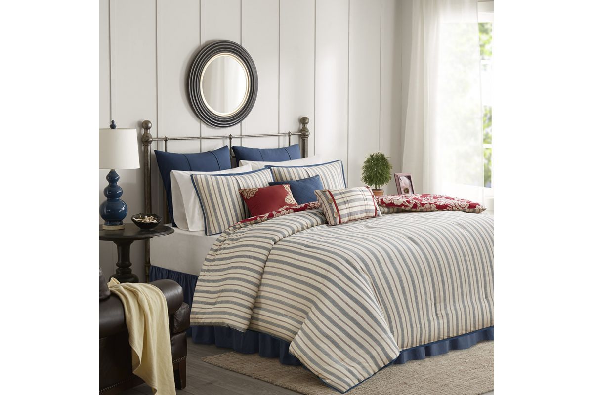 The Madison Park Lucy 9 Piece Cotton Twill Reversible Comforter Set offers a cozy cottage update to your bedroom. This cotton twill comforter features a floral motif in a classic color scheme that flips to a complimentary striped pattern on the reverse. Two coordinating shams flaunt the same pattern as the comforter, while two Euro shams add a touch of color to the comforter set. Three decorative pillows with embroidery and fabric manipulation and a solid bed skirt complete this country comforter set. This bedding set is also OEKO-TEX certified, meaning it does not contain any harmful substances or chemicals to ensure quality comfort and wellness.