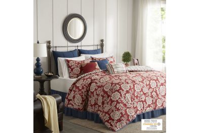 The Madison Park Lucy 9 Piece Cotton Twill Reversible Comforter Set offers a cozy cottage update to your bedroom. This cotton twill comforter features a floral motif in a classic color scheme that flips to a complimentary striped pattern on the reverse. Two coordinating shams flaunt the same pattern as the comforter, while two Euro shams add a touch of color to the comforter set. Three decorative pillows with embroidery and fabric manipulation and a solid bed skirt complete this country comforter set. This bedding set is also OEKO-TEX certified, meaning it does not contain any harmful substances or chemicals to ensure quality comfort and wellness.