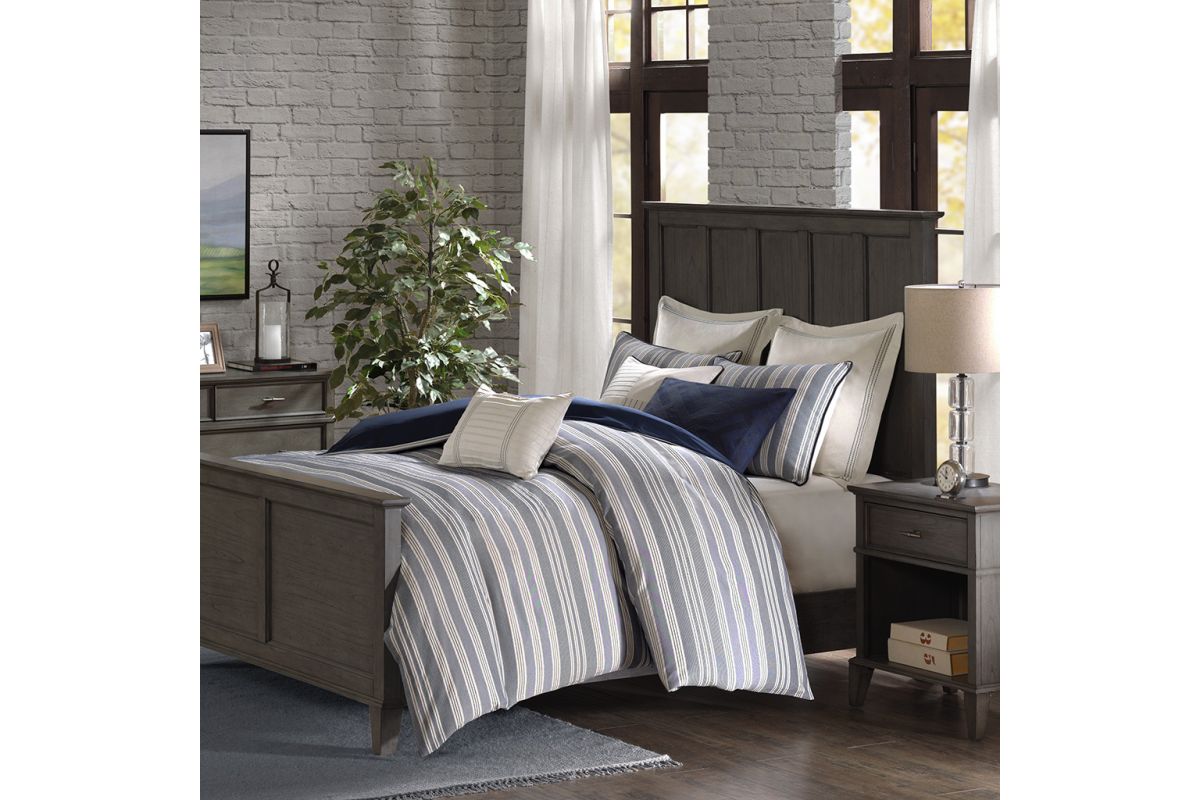The Madison Park Signature Farmhouse Comforter Set sports a navy and ivory woven jacquard stripe pattern for a fresh update to your space. The versatile color palette works well in any style bedroom. The cotton blend comforter is oversized and overfilled to provide exceptional warmth and comfort with a removable cover that makes it easy to clean. Coordinating shams highlight the mixed weaves design on the top of bed, while Euro shams with embroidered details add a natural touch to the on-trend look. Three decorative pillows with varying linear patterns and distinct stitching details complement the easy look and feel of this jacquard comforter set. This set comes with a removable duvet-style insert that is secured by inner ties and a hidden button closure. This provides no visible bartacking lines on top of the bed to create a smooth, clean face. Dry clean comforter cover only and machine wash comforter filler.