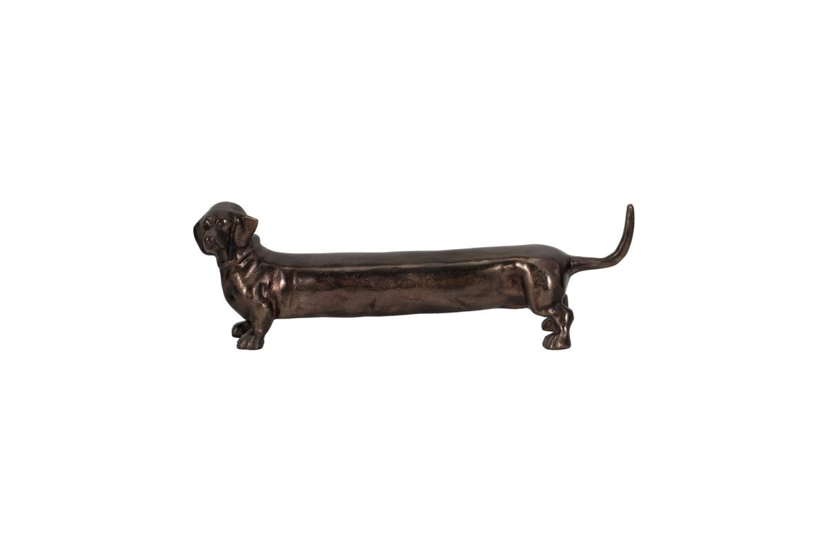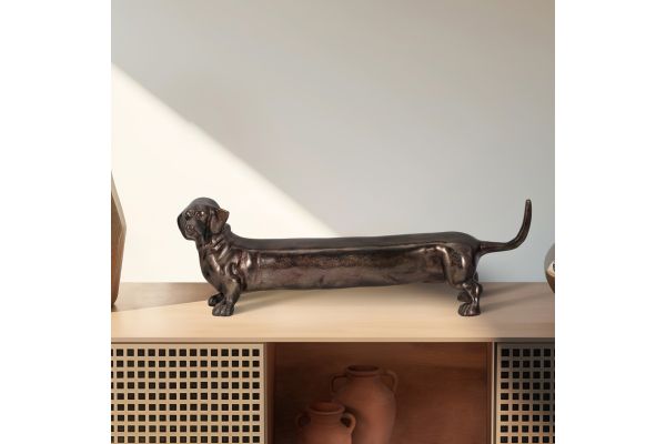 Add a touch of playful charm and sculptural sophistication to your home with the Cheviot Gold Dog Figurine. Crafted with a rich, antiqued bronze-gold finish, this elongated dachshund-inspired piece captures attention with its whimsical proportions and refined surface texture. Whether perched on a console table, bookshelf, or entryway, its sleek silhouette brings a modern yet timeless personality to any room. The Cheviot Dog is the perfect statement decor for animal lovers and design enthusiasts alike.