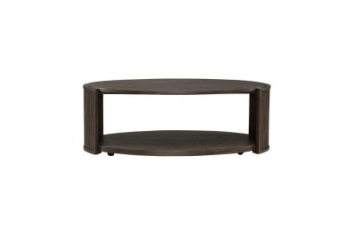 With its sleek lines and modern design, the City View oval cocktail table is a statement of impeccable taste and refined sophistication. Crafted with excellence using Rubberwood solids and Quartered White Oak veneers, this table features a Coffee Bean finish. At the heart of this table lies its distinctive oval-shaped top, a testament to its unique design aesthetic. Softly curved reeded end panels frame the top, adding a touch of texture and visual interest while maintaining a sense of understated elegance. But it's not just about looks—the functionality of this cocktail table is equally impressive. An open bottom shelf provides ample space for storage and display, allowing you to showcase your favorite books, decorative items, or personal treasures with ease. And for added convenience, casters ensure easy mobility whenever needed, allowing you to effortlessly move the table to accommodate your changing needs or preferences. Whether you're entertaining guests or simply rearranging your living space, this table makes it easy to create the perfect layout every time. With its blend of contemporary styling and thoughtful features, the City View oval cocktail table is more than just a piece of furniture—it's a reflection of your unique sense of style and impeccable taste. Whether gracing your living room, den, or entertainment area, it promises to elevate any space with its timeless elegance and undeniable charm.