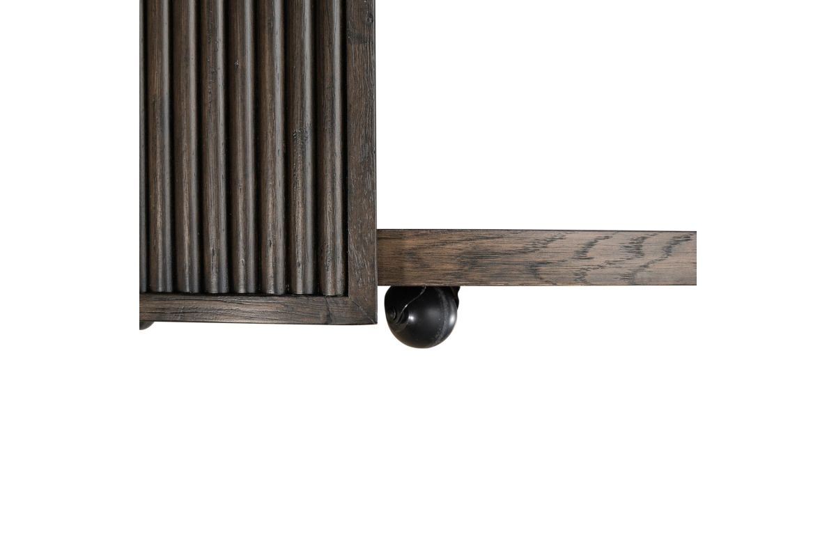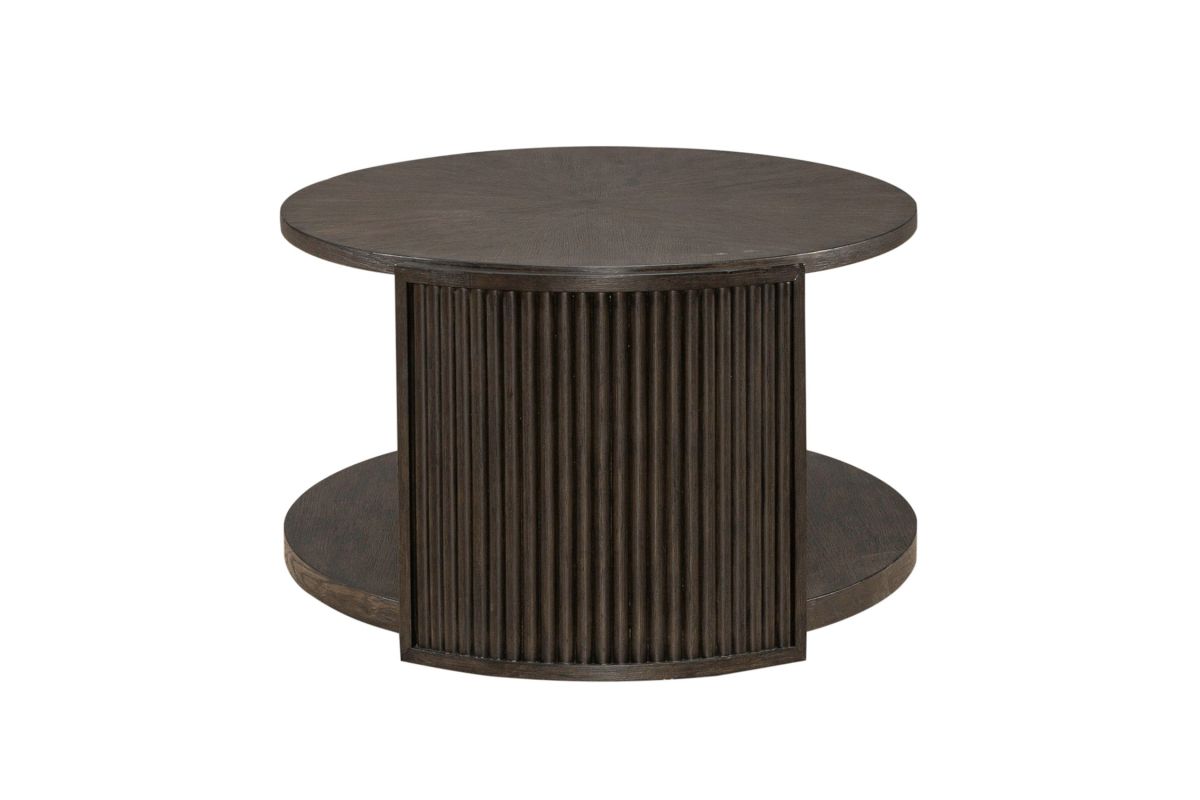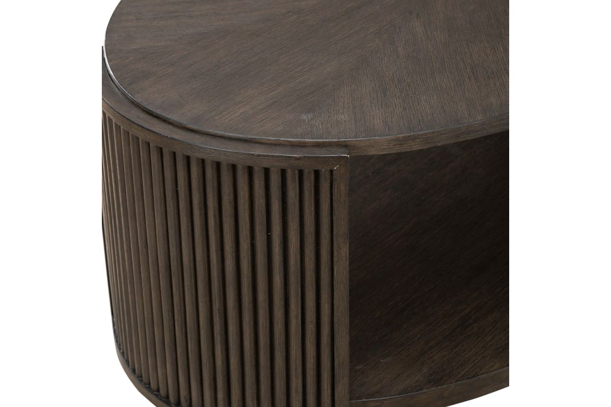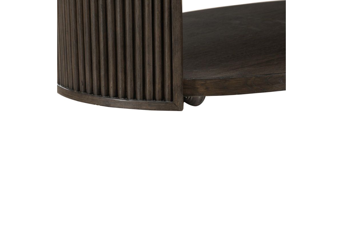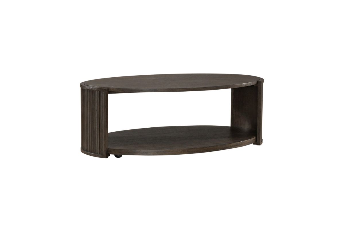 With its sleek lines and modern design, the City View oval cocktail table is a statement of impeccable taste and refined sophistication. Crafted with excellence using Rubberwood solids and Quartered White Oak veneers, this table features a Coffee Bean finish. At the heart of this table lies its distinctive oval-shaped top, a testament to its unique design aesthetic. Softly curved reeded end panels frame the top, adding a touch of texture and visual interest while maintaining a sense of understated elegance. But it's not just about looks—the functionality of this cocktail table is equally impressive. An open bottom shelf provides ample space for storage and display, allowing you to showcase your favorite books, decorative items, or personal treasures with ease. And for added convenience, casters ensure easy mobility whenever needed, allowing you to effortlessly move the table to accommodate your changing needs or preferences. Whether you're entertaining guests or simply rearranging your living space, this table makes it easy to create the perfect layout every time. With its blend of contemporary styling and thoughtful features, the City View oval cocktail table is more than just a piece of furniture—it's a reflection of your unique sense of style and impeccable taste. Whether gracing your living room, den, or entertainment area, it promises to elevate any space with its timeless elegance and undeniable charm.