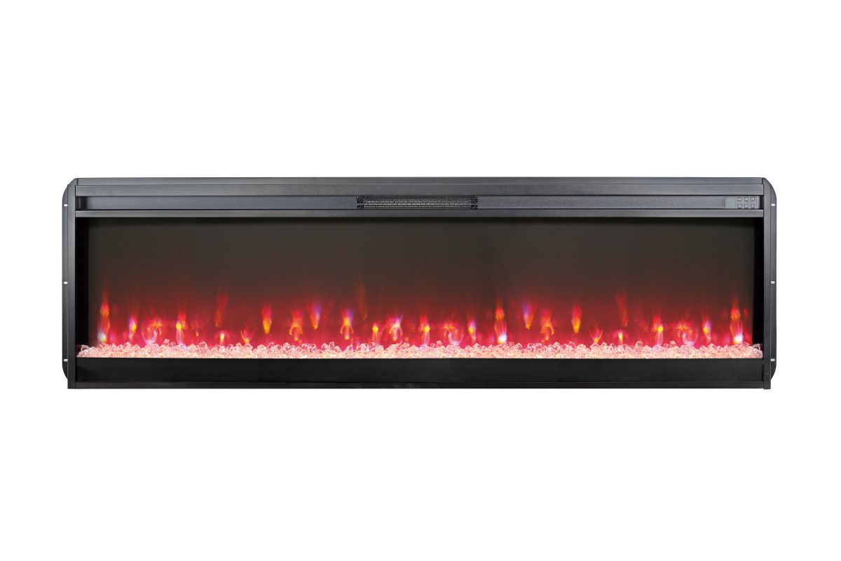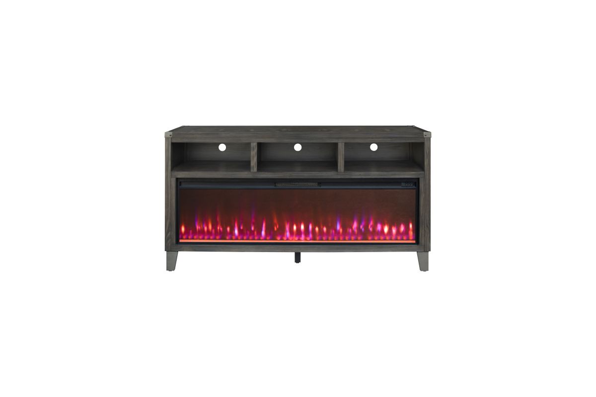 Make watching TV a joy with this large TV stand. Top surface accommodates up to 70-inch TVs. Its rustic-industrial style is sure to complement any contemporary decor through gray coloration, squared edges, zinc-tone corner bracket accents and nailhead detailing. Several vented open cubbies offer impressive shelf space, convenient for keeping all of your electronic gear within reach. Handy cutouts keep cords out of sight. For your added viewing pleasure, the wide fireplace insert puts on a show via remote control.