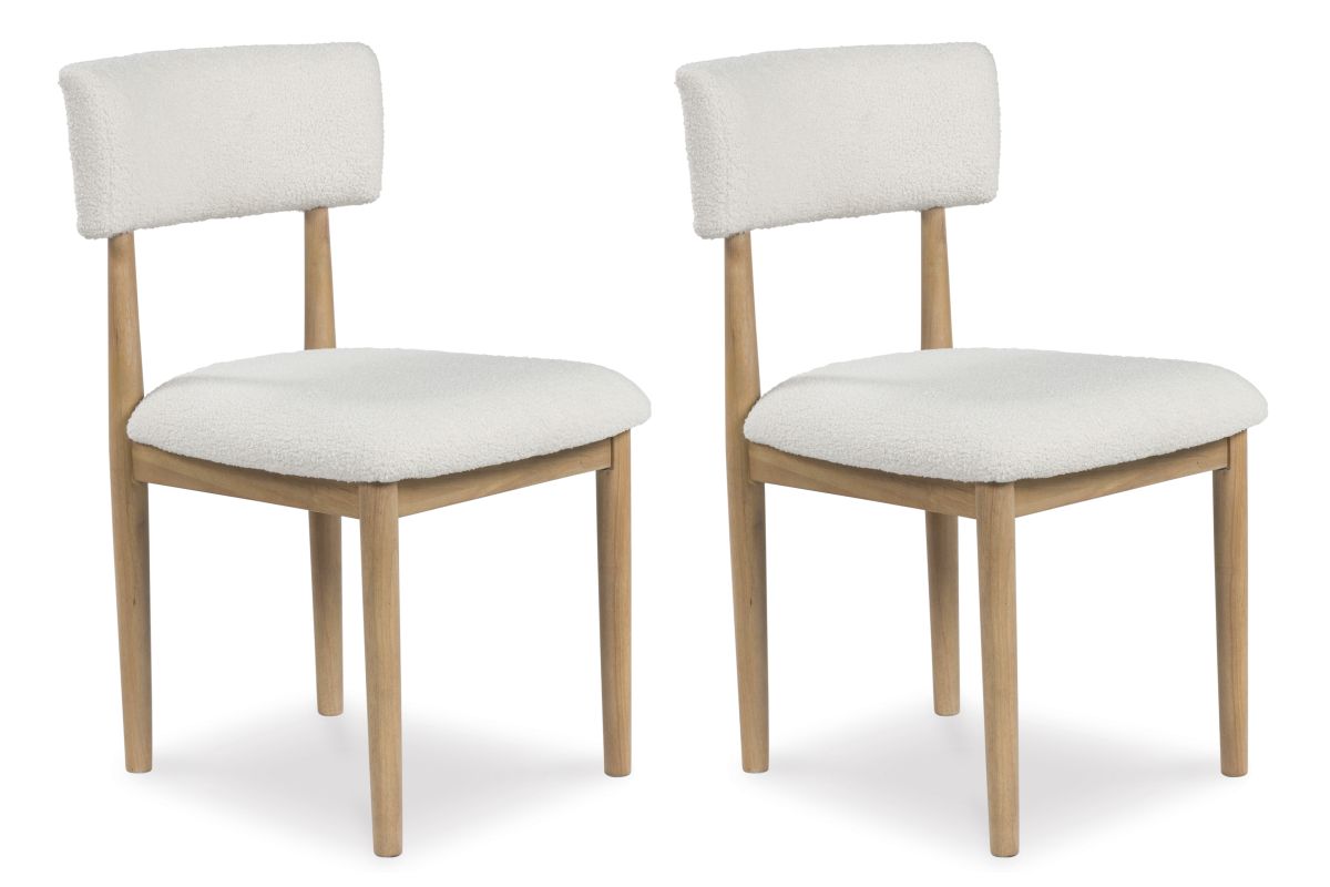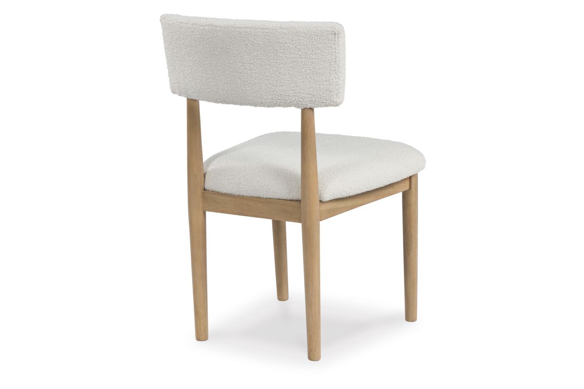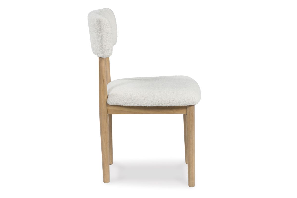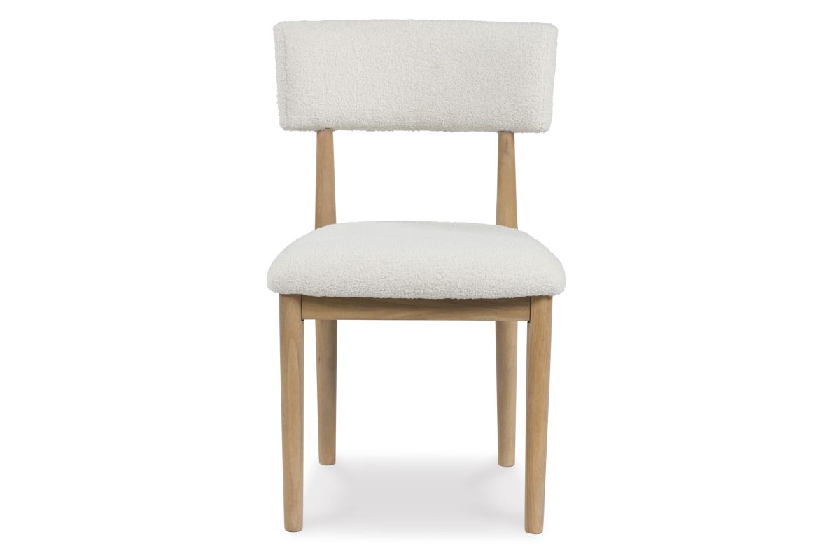 Clean lines meet cool curves with this dining chair. Simple round post legs and a natural finish lend a modern vibe, while softly textured upholstery tempts you to sit and stay awhile. What a delicious choice for a dining room update.