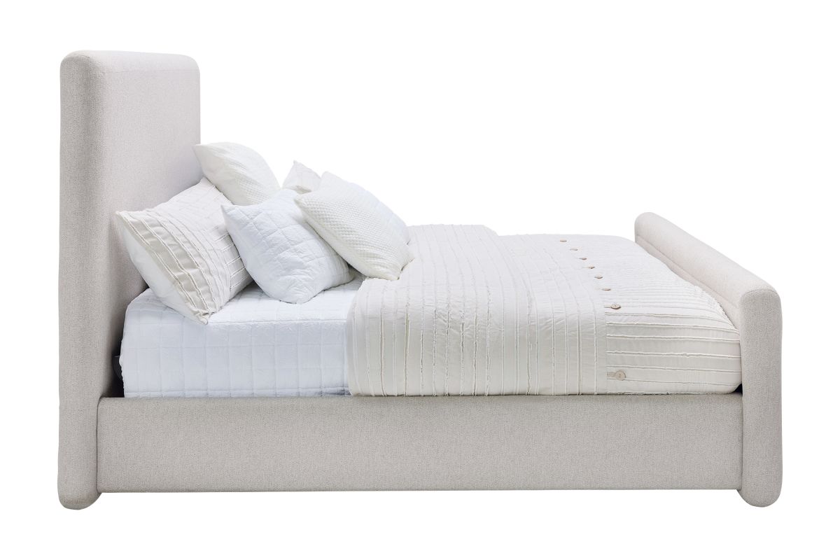The Antibes panel bed is formed with rounded and lushly upholstered panels for the headboard and footboard. Connected by upholstered side panels, the bed has a calm and serene organic style. The bed can be customized with other fabric options.