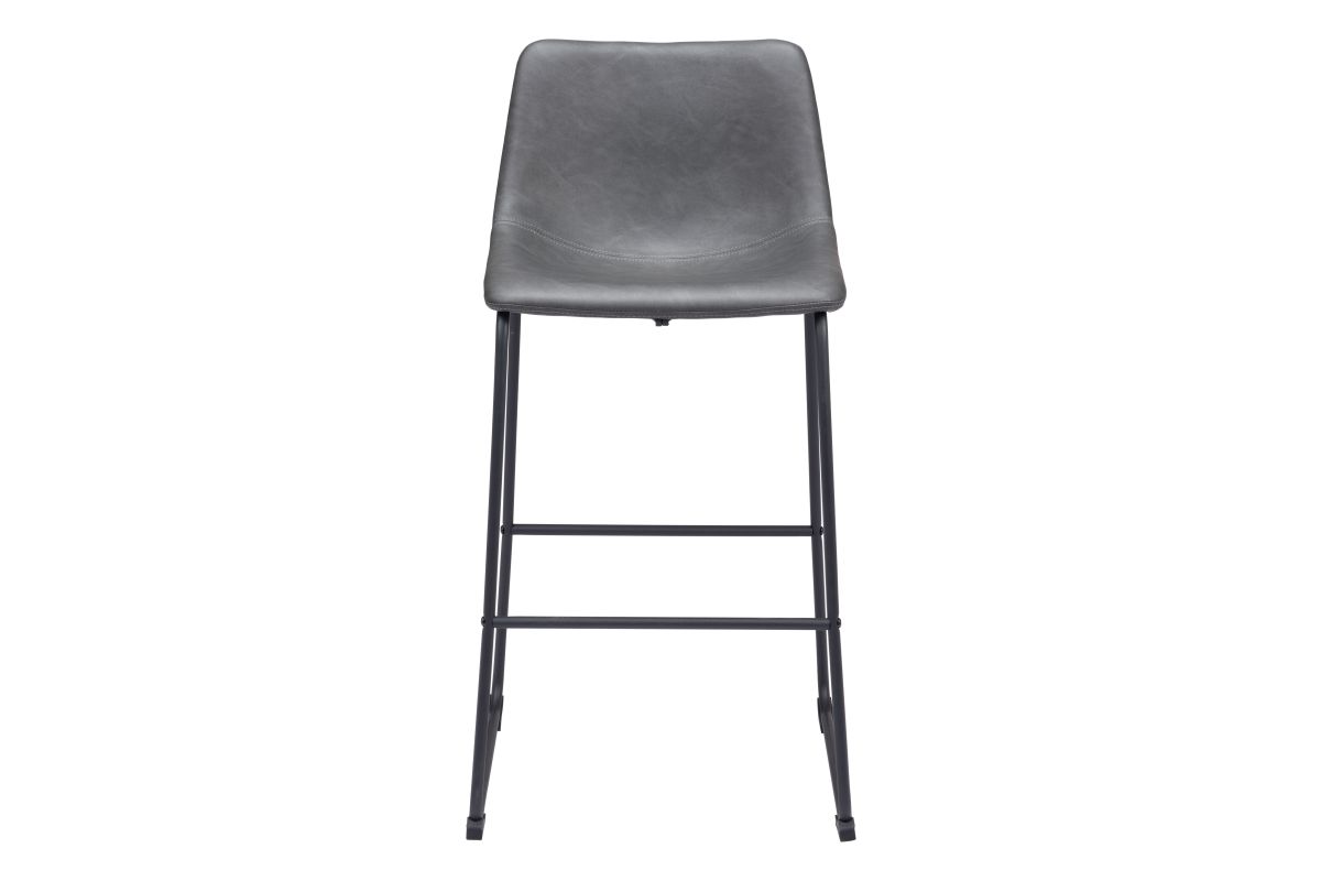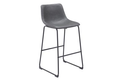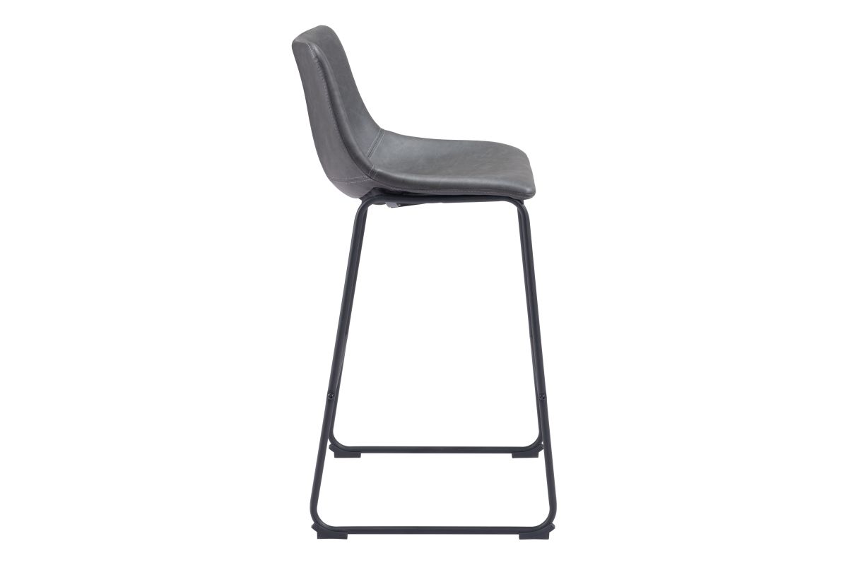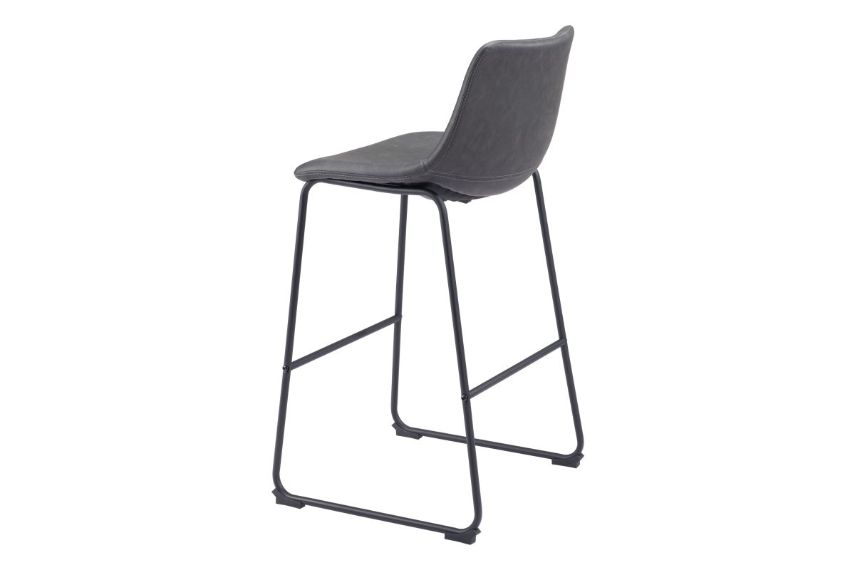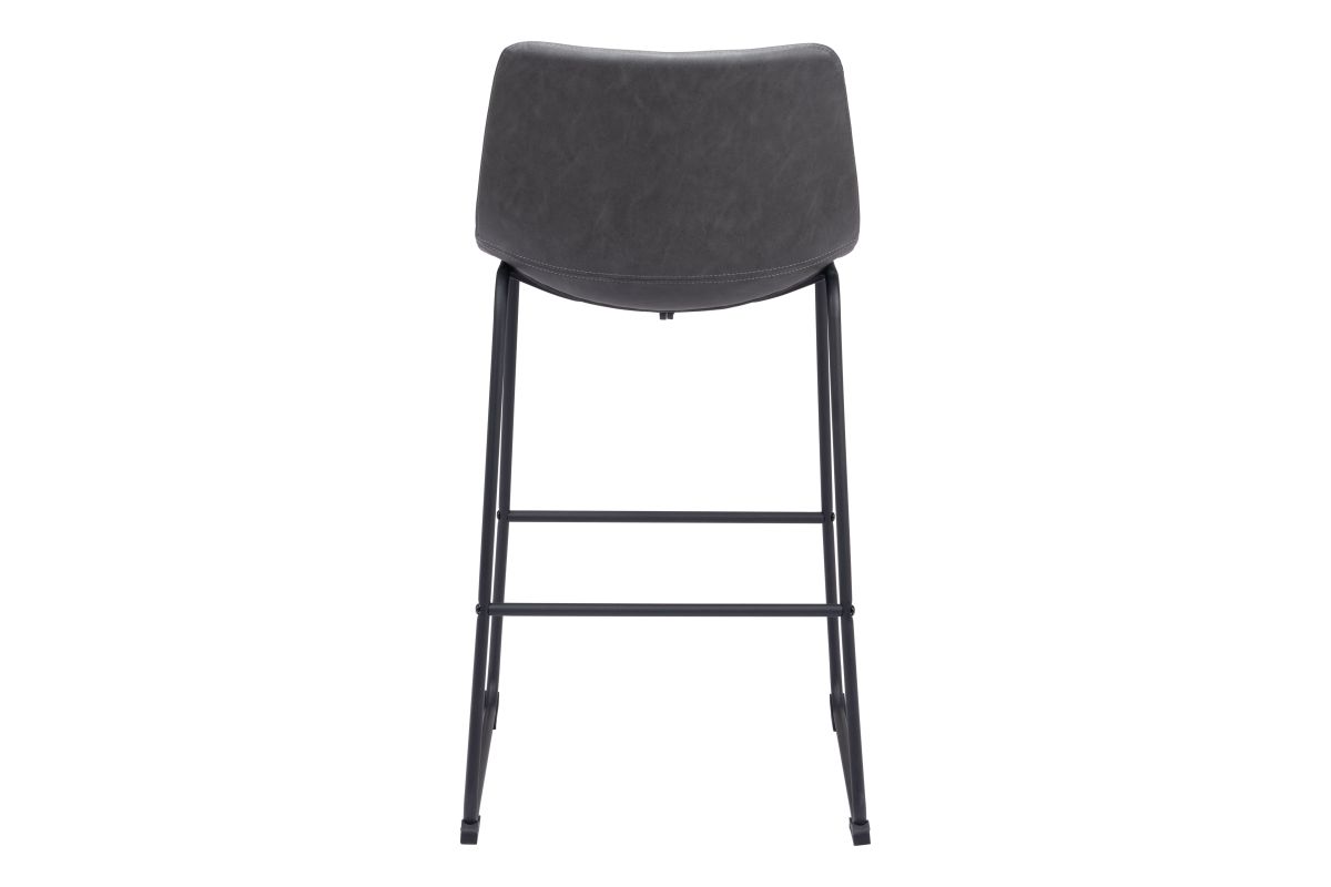 This barstool's seat and back are built with a sculpted design for comfort, It's upholstered in a soft 100% Polyurethane fabric, with a slim profile metal base and two crossbars for stability. The frame is finished in matte black, for a universal appeal.