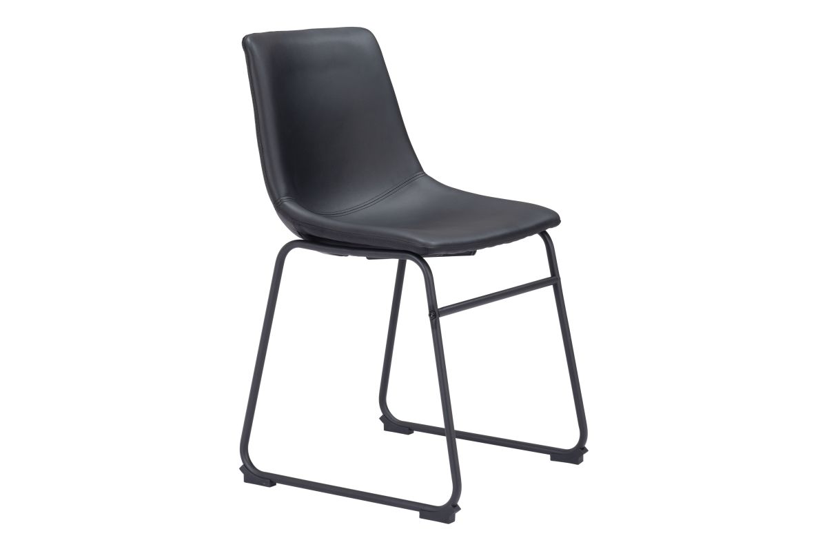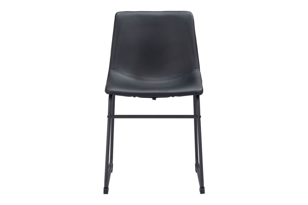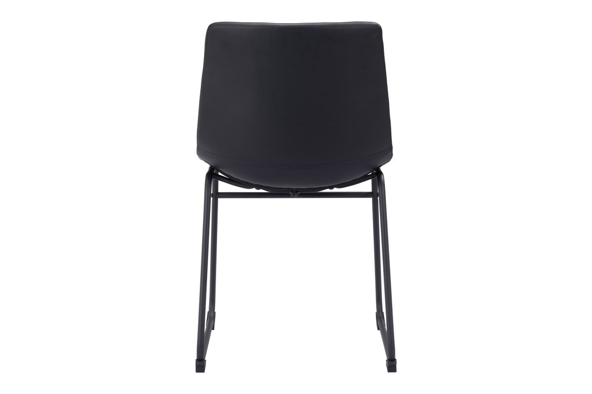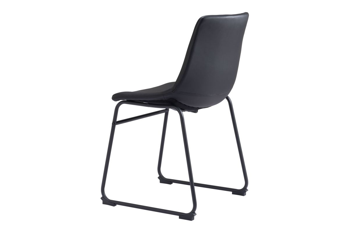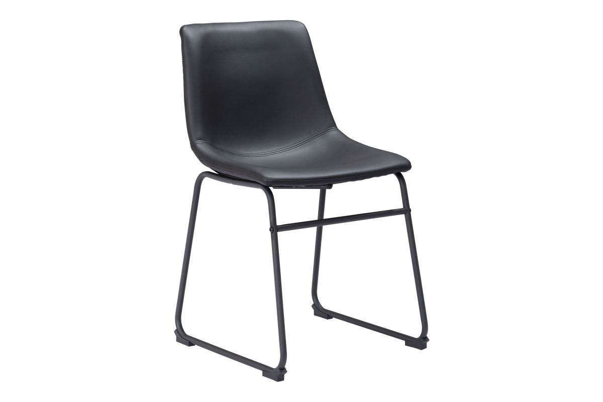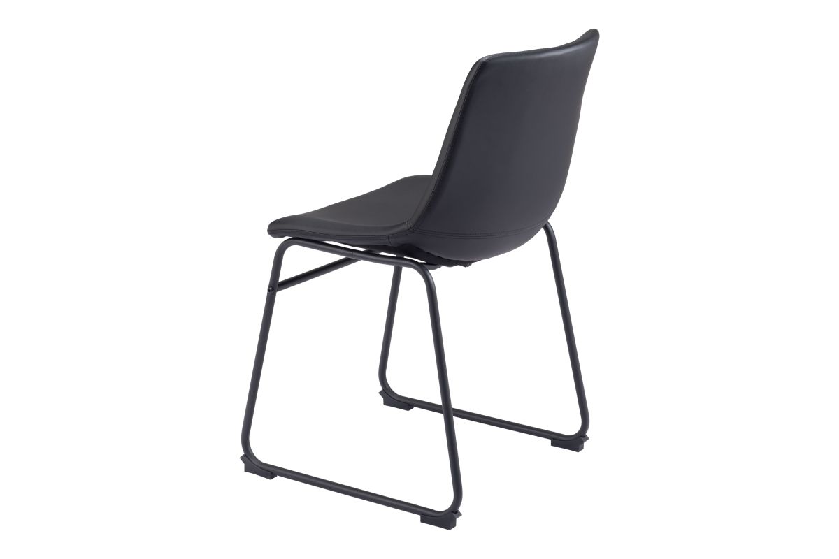 This dining chair's seat and back are built with a sculpted design for comfort. It's upholstered in a soft 100% Polyurethane fabric, with a slim profile metal base and a crossbar for stability. The frame is finished in matte black, for a universal appeal.
