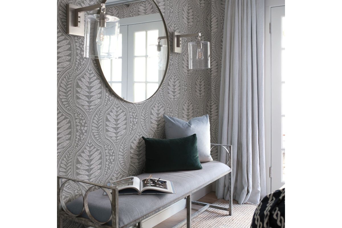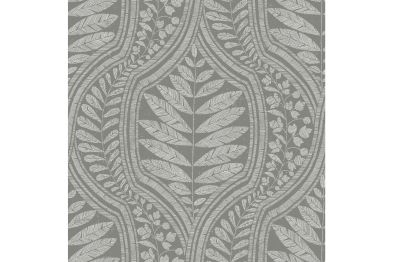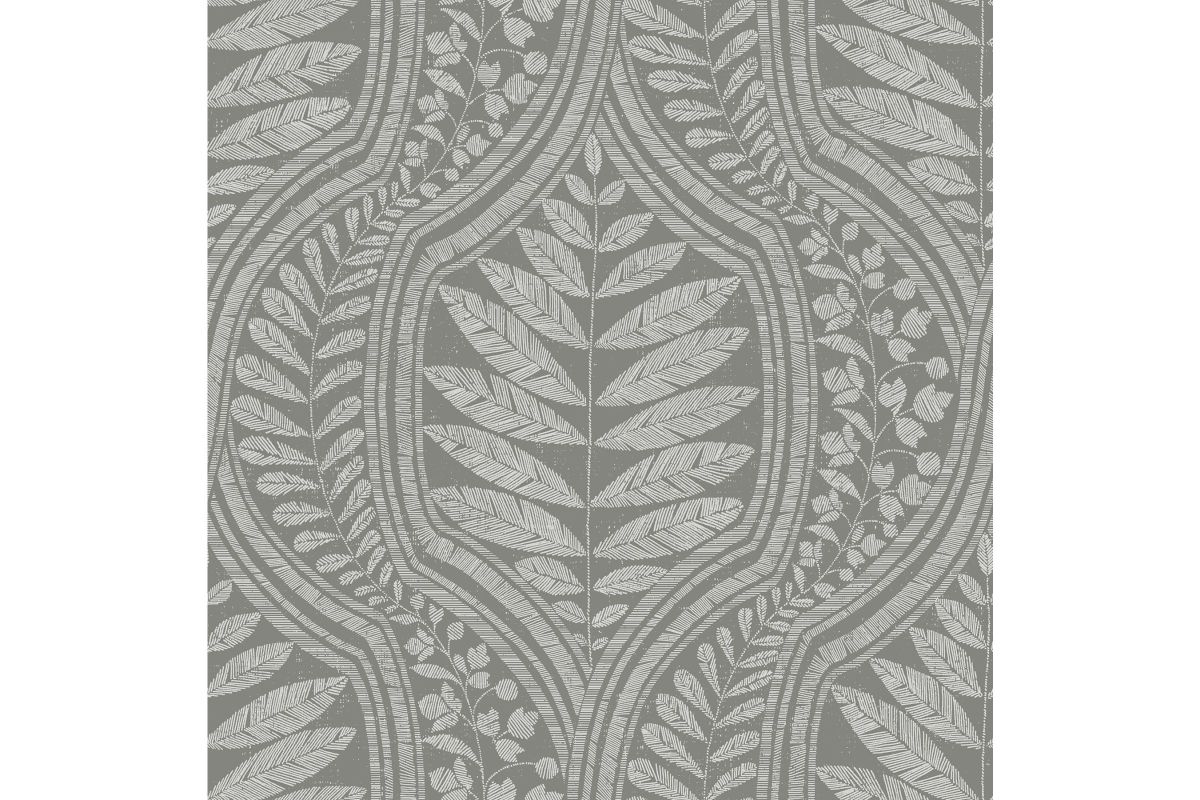 Bohemian mixed with Scandinavian flair, this floral wallpaper features a charming ogee print amidst its leaf design. The grey and white color palette lends a calming ambiance. Juno is an unpasted, non-woven wallpaper.