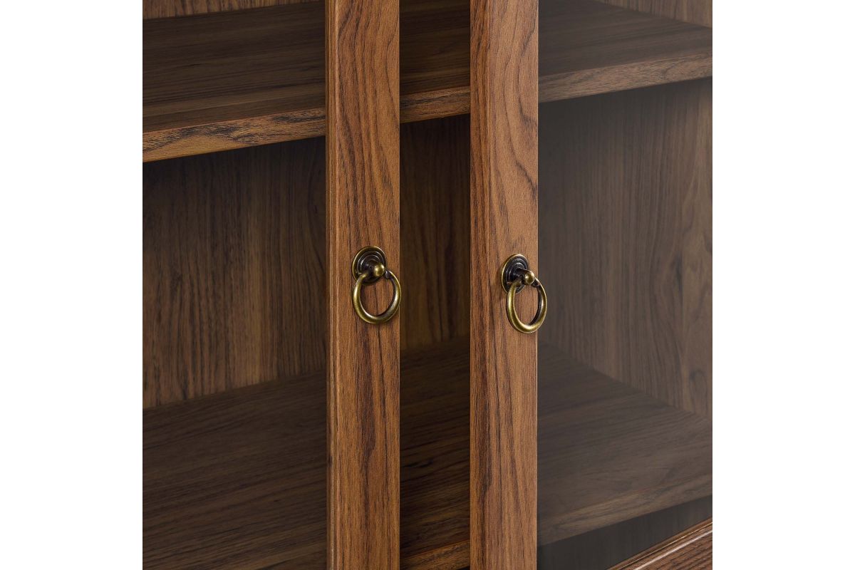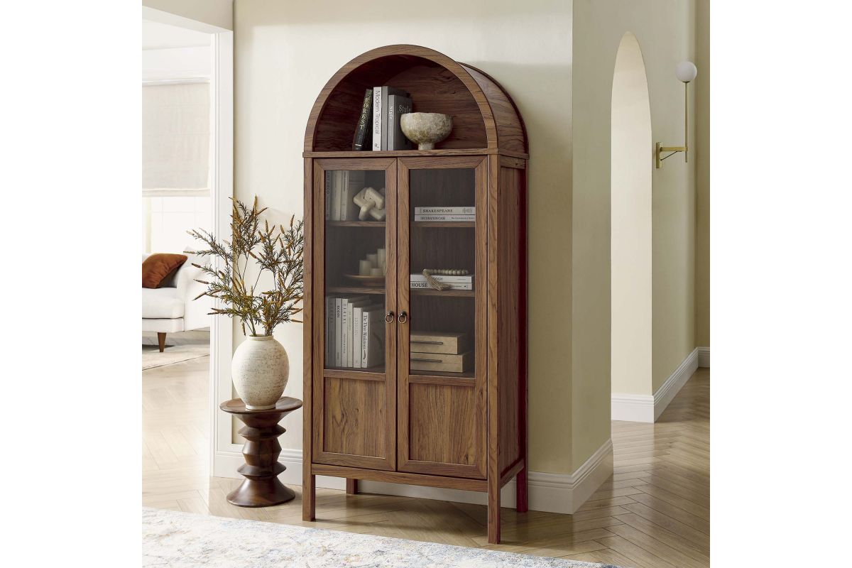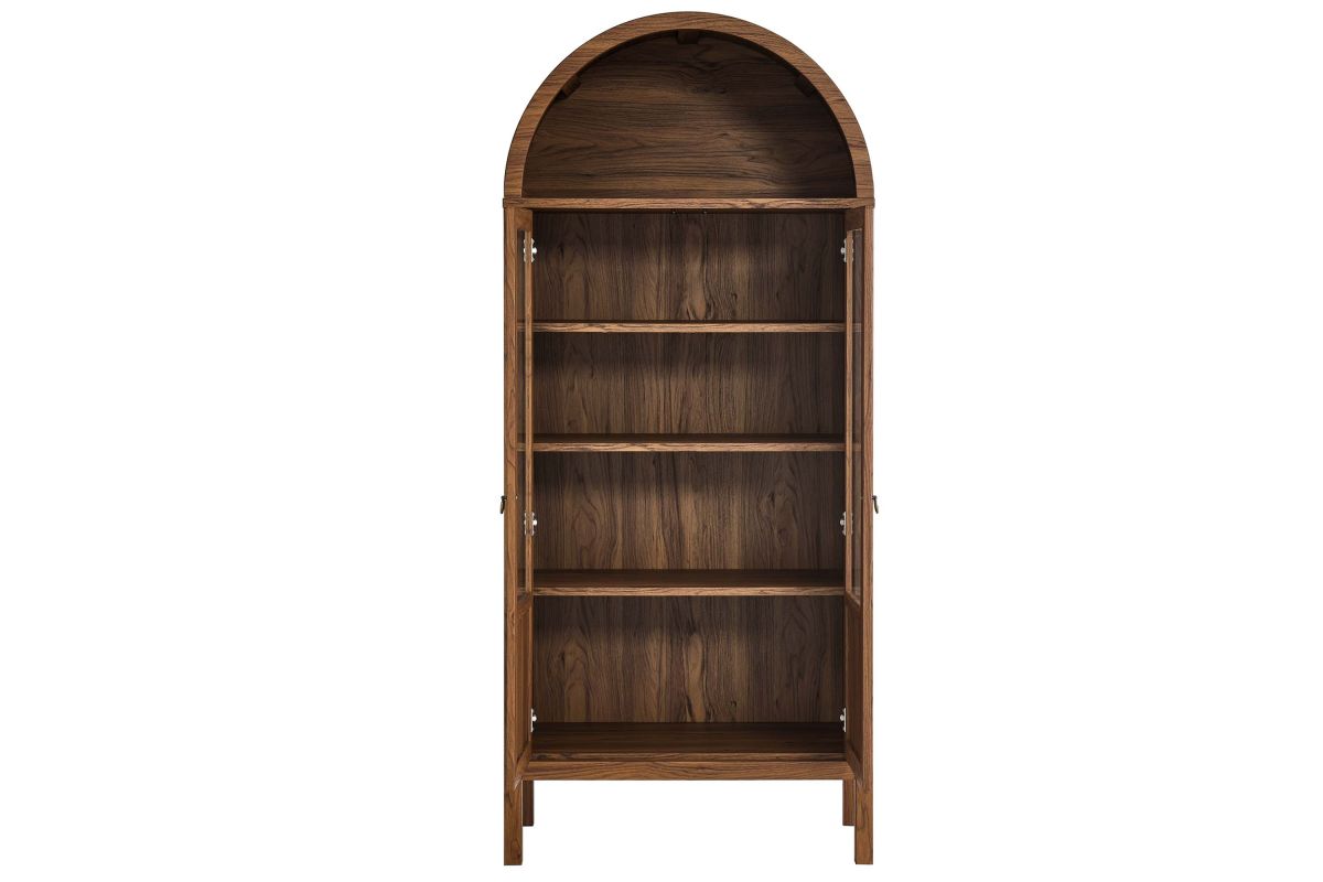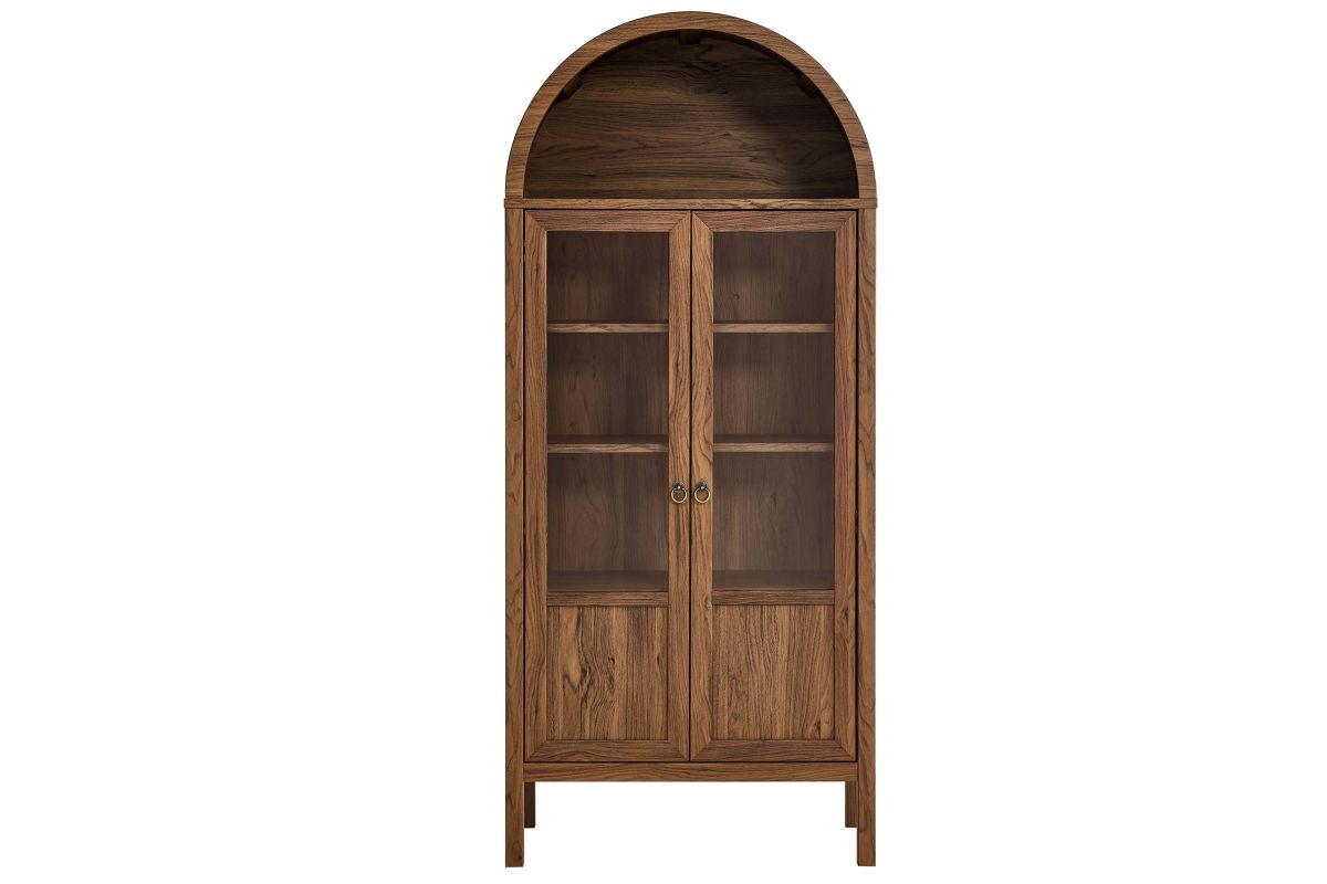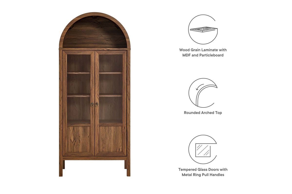 Display your treasures with the stylish design of the Tessa Arched Storage Cabinet. With an impeccable sense of style, this laminated wood display cabinet embodies the elegance of vintage aesthetics and is an ideal accent cabinet for living rooms, hallways, or dining spaces. Crafted from high-quality MDF and particleboard, the Tessa Tall Storage Cabinet is accentuated with refined edge trimming and a rich wood grain laminate. Featuring a functional arched top shelf and two doors highlighted by tempered glass windows, this 71� storage cabinet invites admiration from every angle. Inside, two adjustable shelves and one fixed shelf provide flexible display options, while a roomy compartment below offers concealed storage. The Tessa arched cabinet with doors is adorned with metal ring pull handles with a brushed gold finish and is complete with soft-close hinges, ensuring a silent, smooth interaction. This arched bookcase cabinet stands gracefully on wood legs, thoughtfully fitted with non-marking felt pads to protect your floors. Assembly required. Weight Capacities: Arched Shelf: 88 lbs, Adjustable & Fixed Shelves: 70 lbs, Bottom Shelf: 84 lbs