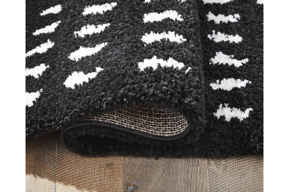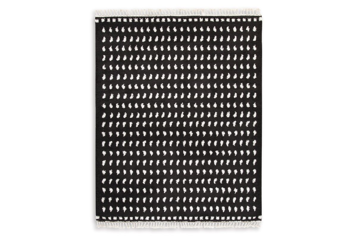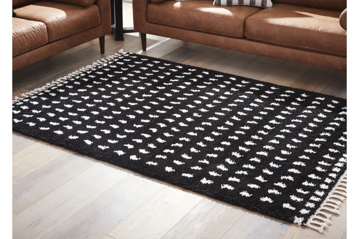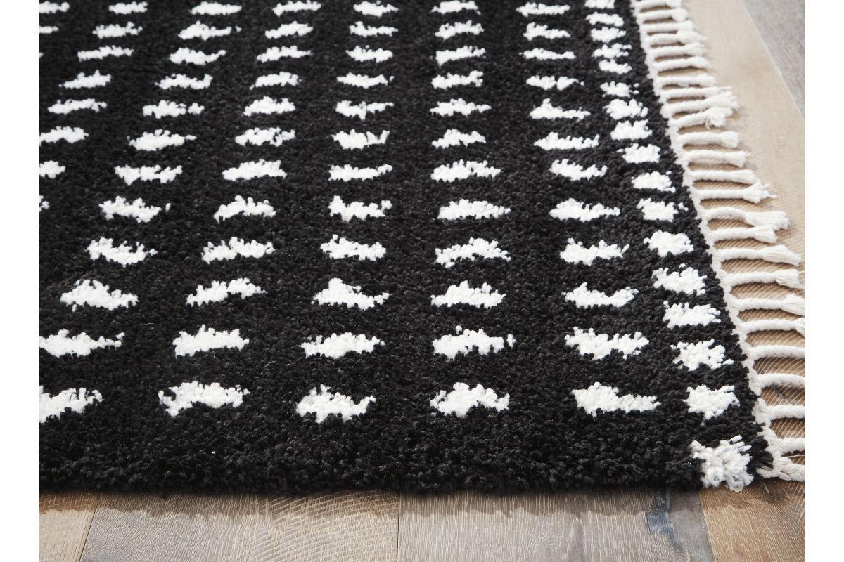 Sink your feet into this modern area rug. Offering a luxurious shag with a woven dot design in black and white, it adds sophistication without sacrificing comfort or durability. A braided tassel edge completes the design of this family-friendly accent rug.