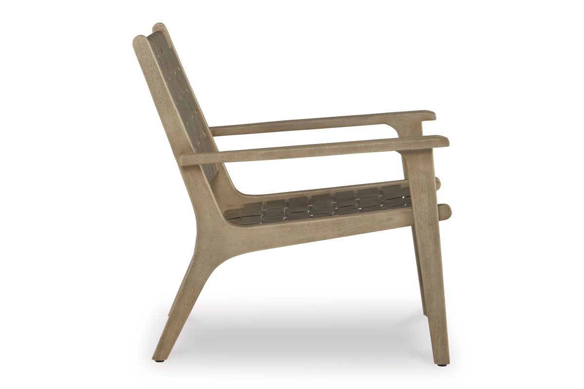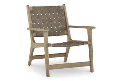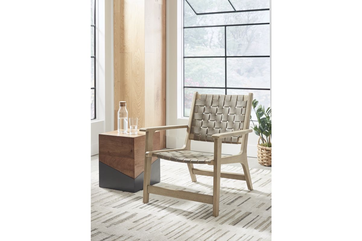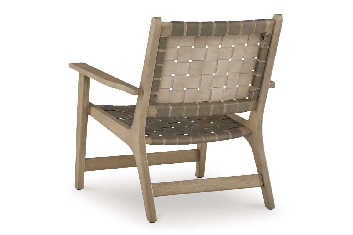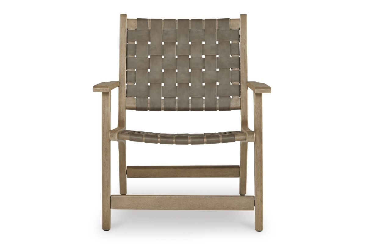 Express your sense of contemporary yet comfortable style with this accent chair. The on-trend frame is accented by taupe leather strips in a basket weave pattern for a mid-century modern aesthetic. Tuck this gem into your living room or home office for a cool seat.