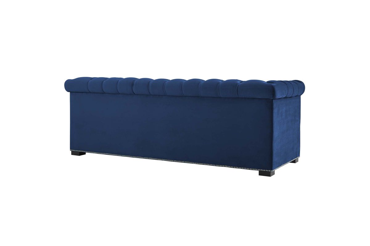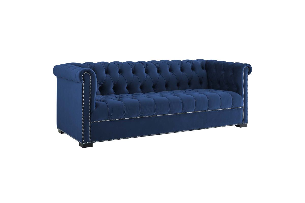 An inspired take on the ever-popular classic, Heritage Performance Velvet Sofa reflects the timeless silhouette of the traditional Chesterfield sofa with its rolled armrests and deep button tufting, while chic nailhead trim offers a luxurious update. An elegant addition to living and lounge spaces alike, Heritage's stain-resistant performance velvet upholstery, broad profile, black birch wood legs, and dense foam padding grants a comfortable place to sit, relax, and entertain. Sofa Weight Capacity: 1322 lbs.