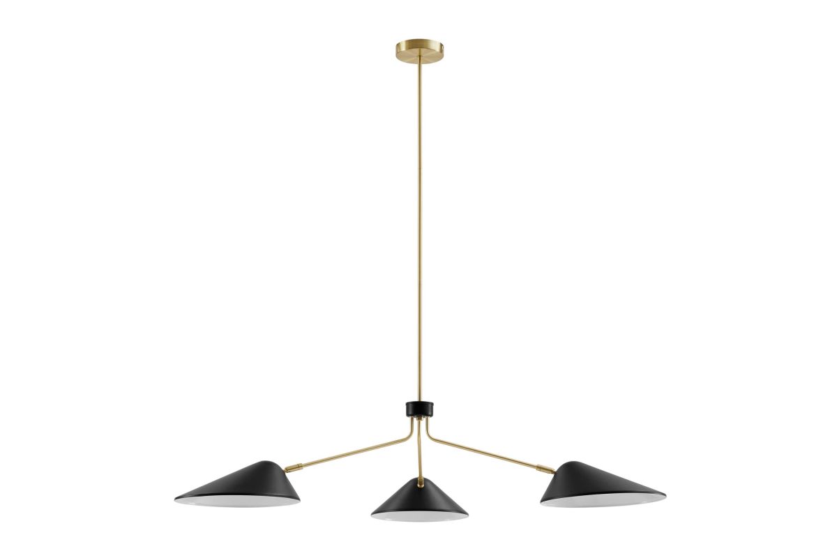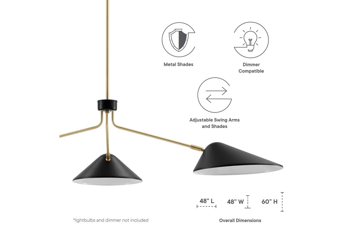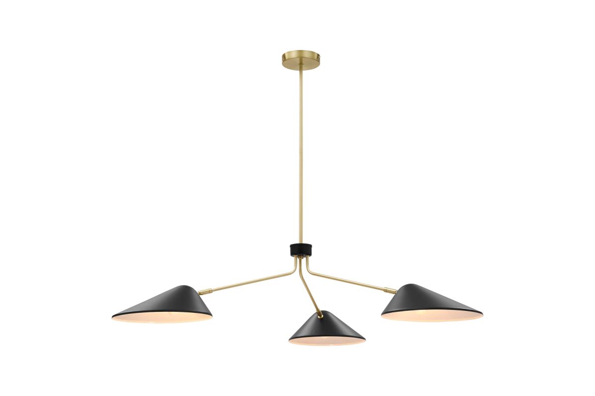 The design integrity of the Journey 3-Light 14" Arm Pendant assures artful and functional illumination in your dining room, living room, or bedroom. Create kitchen task lighting with the sleek swing-arm powder-coated metal shades. This streamlined triple-light pendant compliments a variety of decors, from mid-century modern to minimalist contemporary. A satin brass ceiling canopy and height-adjustable hanging rods enhance the radiating essence of this elegant pendant light fixture. The Journey Pendant Light is compatible with dimmer switches (not included). Requires 3 E26 bulbs, 40W max or LED equivalent (not included). Professional installation required.