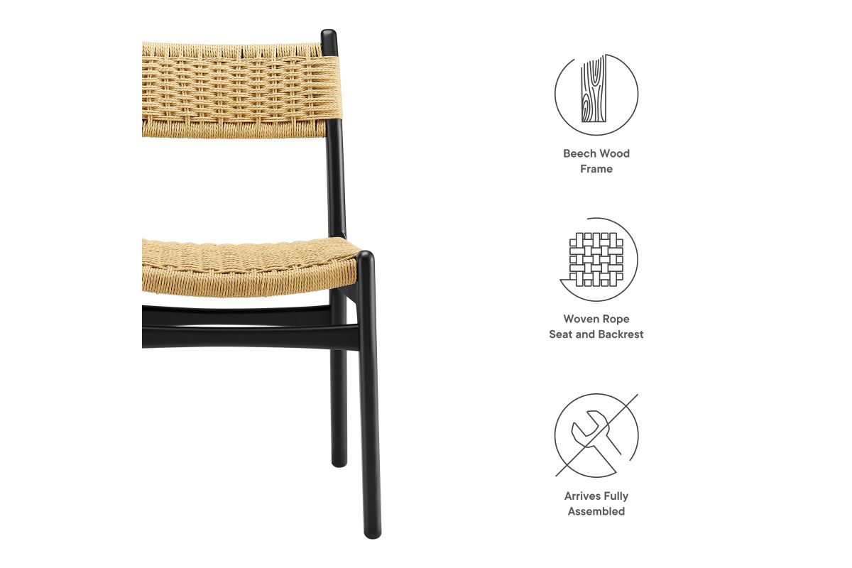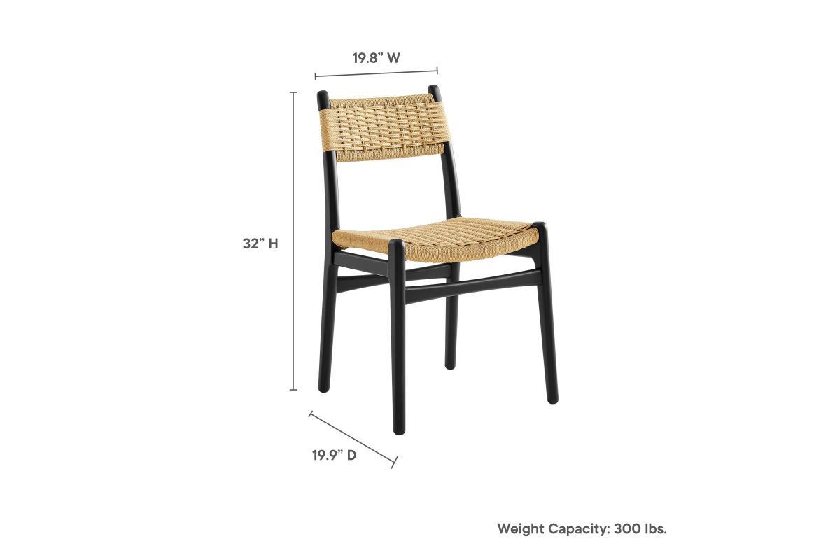 Transform your dining area with the distinctive style of the Wynn Dining Side Chairs, where natural textures meet a sleek, modern silhouette. This set of 2 dining chairs doesn't just sit pretty�these chairs add a breezy charm to your home with their open, airy design and cool, woven rope backrest and seat. Crafted with a sturdy beech wood frame, these woven dining chairs bring a unique blend of comfort and style to any dining room, kitchen, or office. The slightly curved frame and carefully placed stretchers on these modern dining chairs offer both aesthetic appeal and structural integrity. Whether you�re seeking versatile dining table chairs, stylish reception chairs for an office, or a striking set of 2 living room accent chairs, the Wynn Wood and Rope Dining Chairs deliver. Arriving fully assembled, this set of 2 chairs combines mid-century modern inspiration with contemporary elegance, fitting seamlessly into a range of decors. Embrace the blend of natural materials and modern design, and let your space tell a story of style and sophistication. Weight Capacity Per Side Chair: 330 lbs.