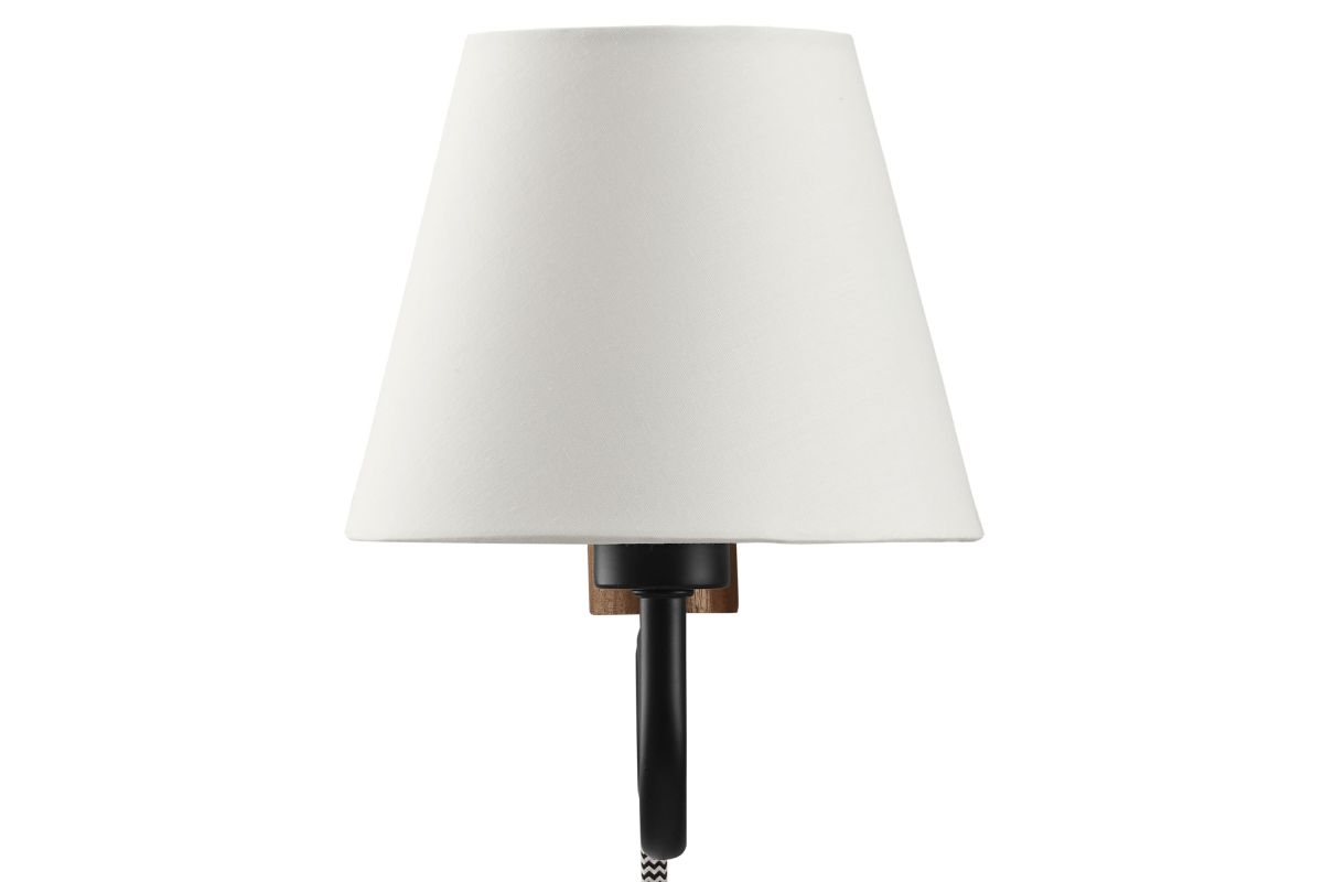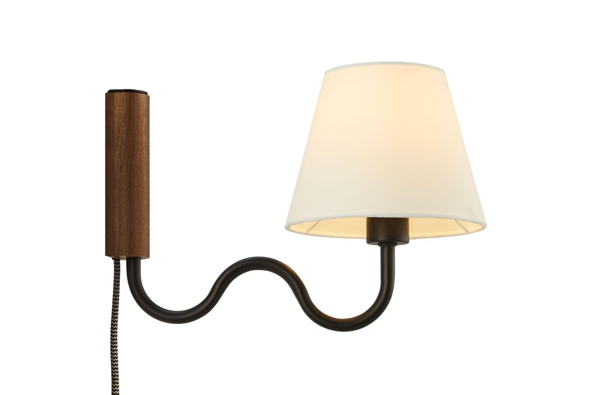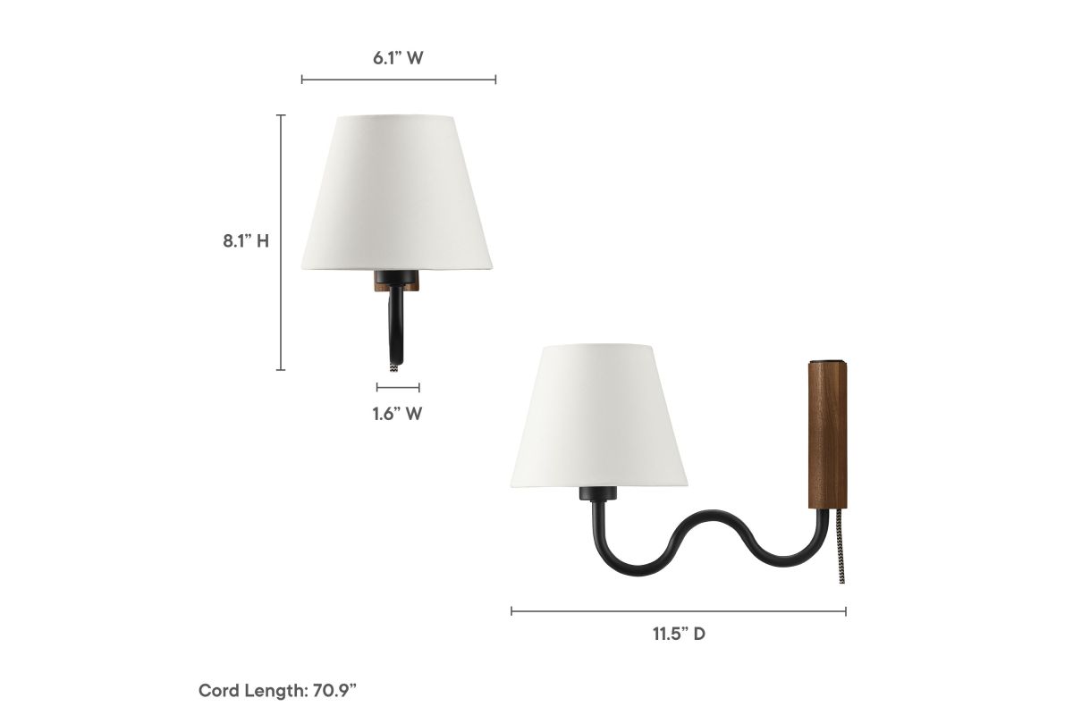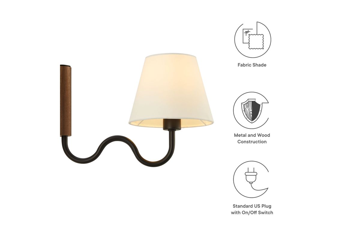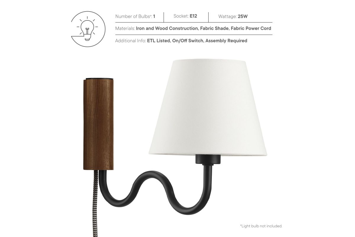 Illuminate your living space with the Sunlit Swivel Wall Sconce. A beautifully crafted wooden backplate anchors the design, offering a touch of natural aesthetics that complements any room. This wall sconce with fabric shade diffuses light to cast a warm, welcoming glow, perfect for a bedroom, living room, lounge space, or hallway. Function meets sophistication in this wall-mounted reading lamp's design, with a 144� swivel that lets you direct light where it's most needed. Conveniently designed, this wall lamp features a plug-in power cord and convenient on/off switch and offers a practical solution to avoid the need for hardwiring. The powder-coated metal rod features an undulating squiggle design reminiscent of ocean waves. Standing as a testament to playful form and modern wall sconce style, the ETL-listed Sunlit Wall Light requires one E12 25W bulb (not included). Assembly required.