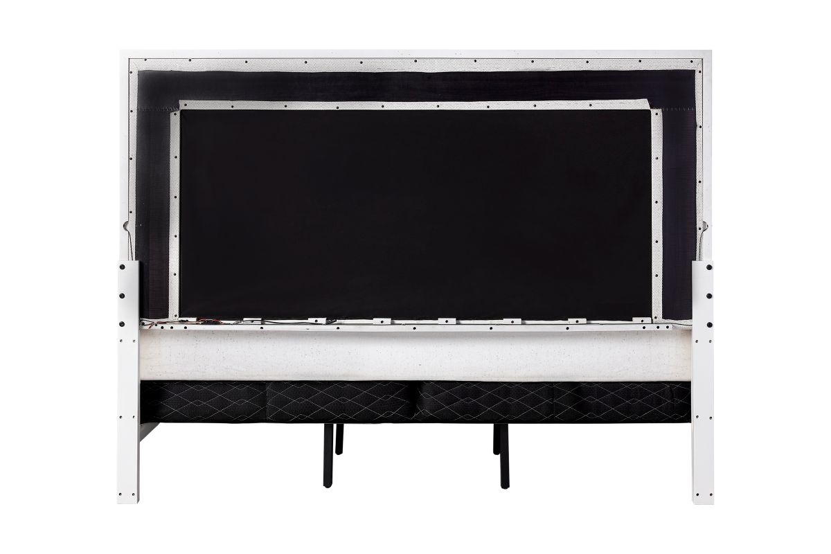 This stunning Sabrina bedroom set features a contemporary design highlighted by integrated LED lighting. The headboard, dresser, chest, and nightstand all include sleek LED accents, adding a touch of glamour and functionality to the room. The LED lights provide a soft, ambient glow that enhances the modern aesthetic while offering convenient illumination.