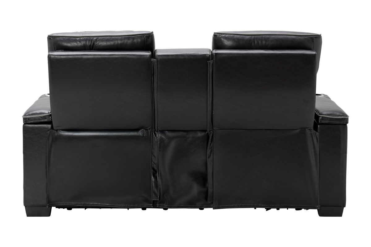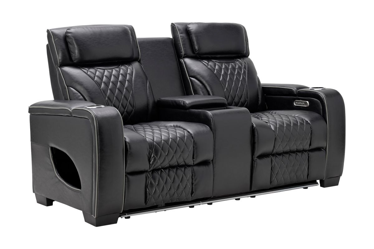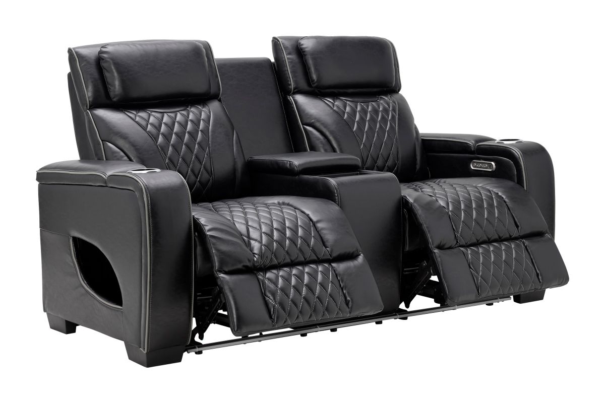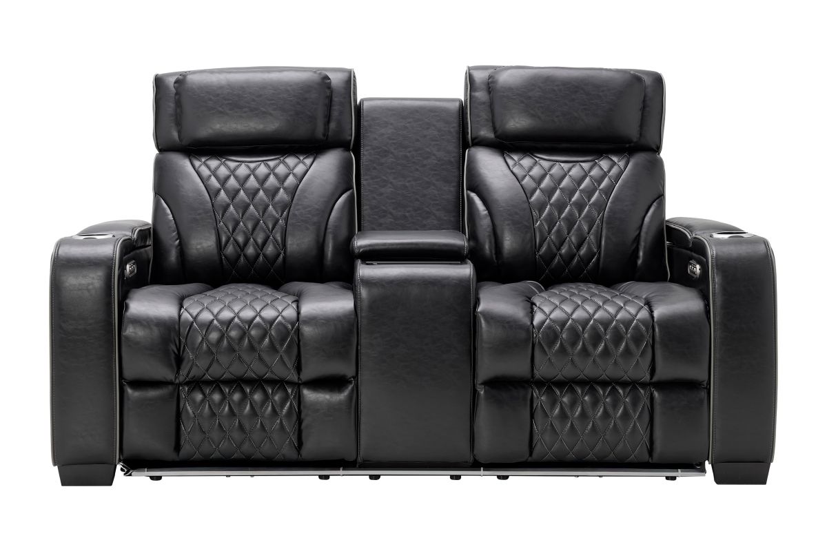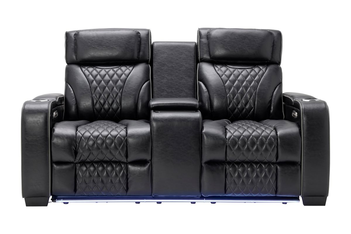 The Zodiac Dual Power Reclining Console Loveseat combines style, functionality, and premium comfort. Enjoy dual power reclining with independent headrest and footrest control, plus a center console that offers deep storage and dual cupholders. Built-in LED lights along the base and sides add modern flair and subtle ambiance. Finished in sleek black with quilted accents, this piece delivers theater-style seating right in your living room.Designed for style, built for relaxation—this collection transforms your living room into a luxurious entertainment zon