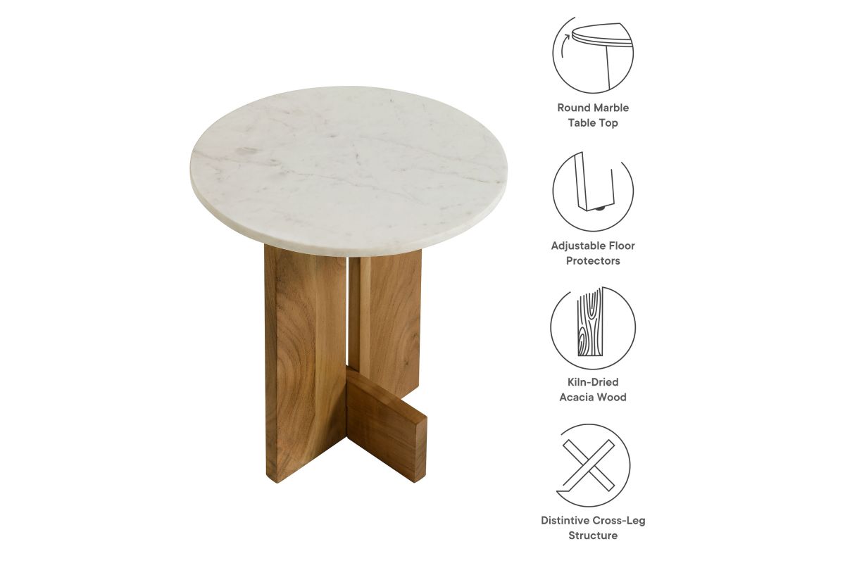 Revitalize your space with the classic-meets-modern design of the Tarin Round Side Table. Featuring a solid marble top that exudes elegance while resting on sturdy acacia wood legs, this marble round table complements a variety of interiors from mid-century modern to minimalist. The accent table's distinctive base highlights the natural beauty of wood, with its crossbeam-style legs featuring wide, flat ends that extend outward for a sturdy and grounded look. Perfect as a marble end table for the living room or an accent table in the bedroom, Tarin pairs natural elements with a chic, updated look. Designed for versatility, it also works beautifully as a modern drink table, side cocktail table, or even a marble plant table. However you choose to use it, Tarin comes with adjustable floor protectors for added stability while safeguarding your floors from scratches. Assembly required. Weight Capacity: 33 lbs.