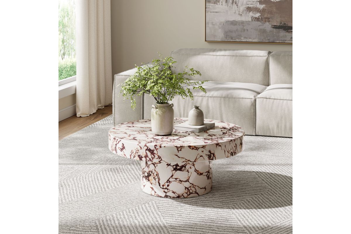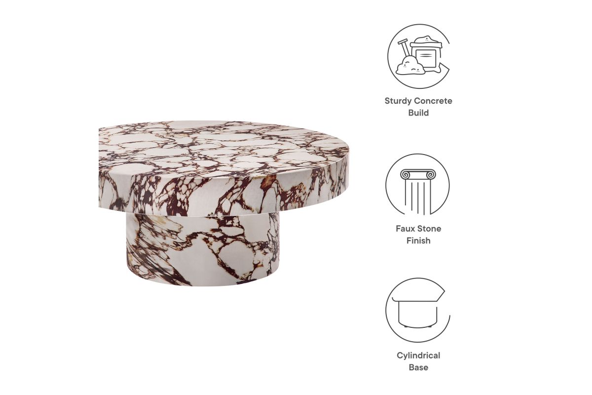 The Alora Round Concrete Coffee Table creates an unforgettable focal point with its bold design, adding a fresh, modern touch to any area you place it. Crafted from solid concrete, the cylindrical base beautifully supports its round top, forming a striking yet minimalist silhouette. The faux stone finish enhances its smooth, luxurious look, while the non-marking leveling feet provide stability and protect your floors from scratches. Designed to stand out in any room, this round marble coffee table is perfect for the living room, patio, or any space seeking a clean, contemporary update. The Alora 34" Living Room Table offers the perfect versatile size, making it an ideal choice for everything from holding drinks to displaying decorative accents with style and ease. Whether you're looking for an outdoor stone coffee table or a stylish low coffee table for inside, Alora combines durability with a chic, refined edge. Easy assembly required. Weight Capacity: 230 lbs.