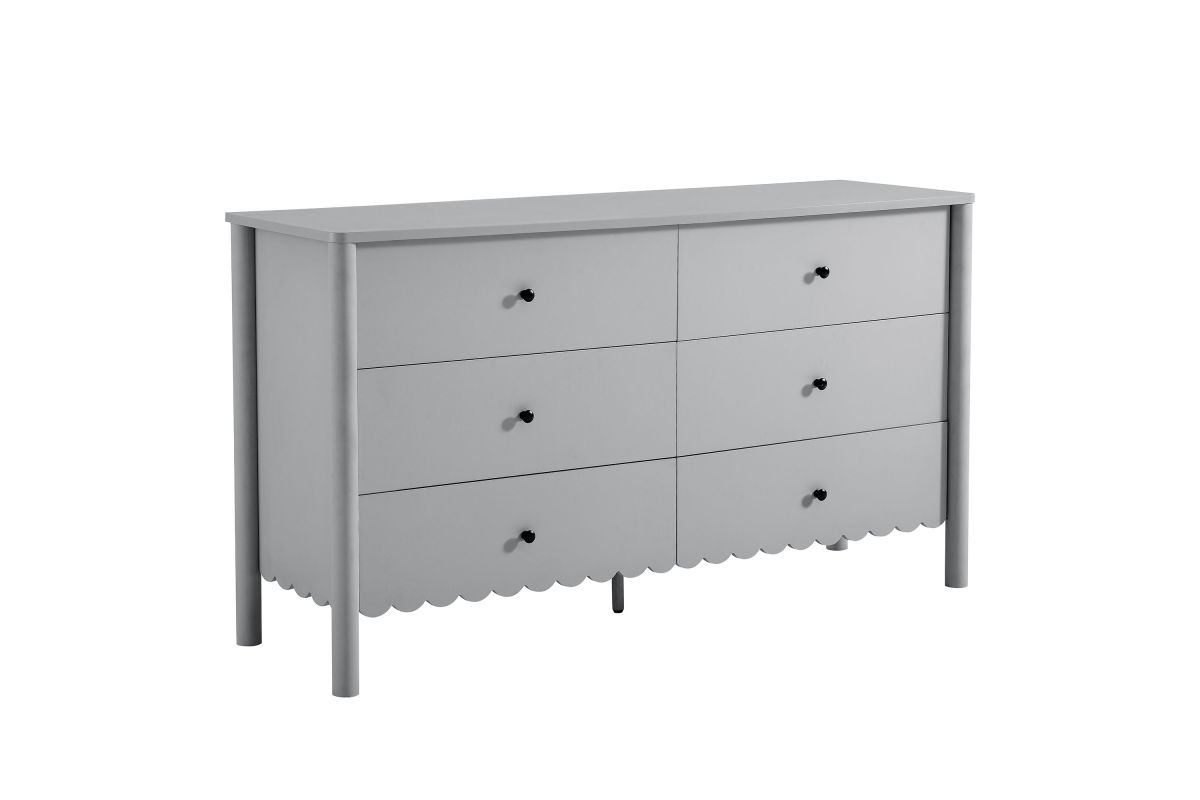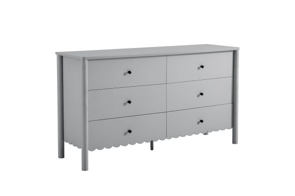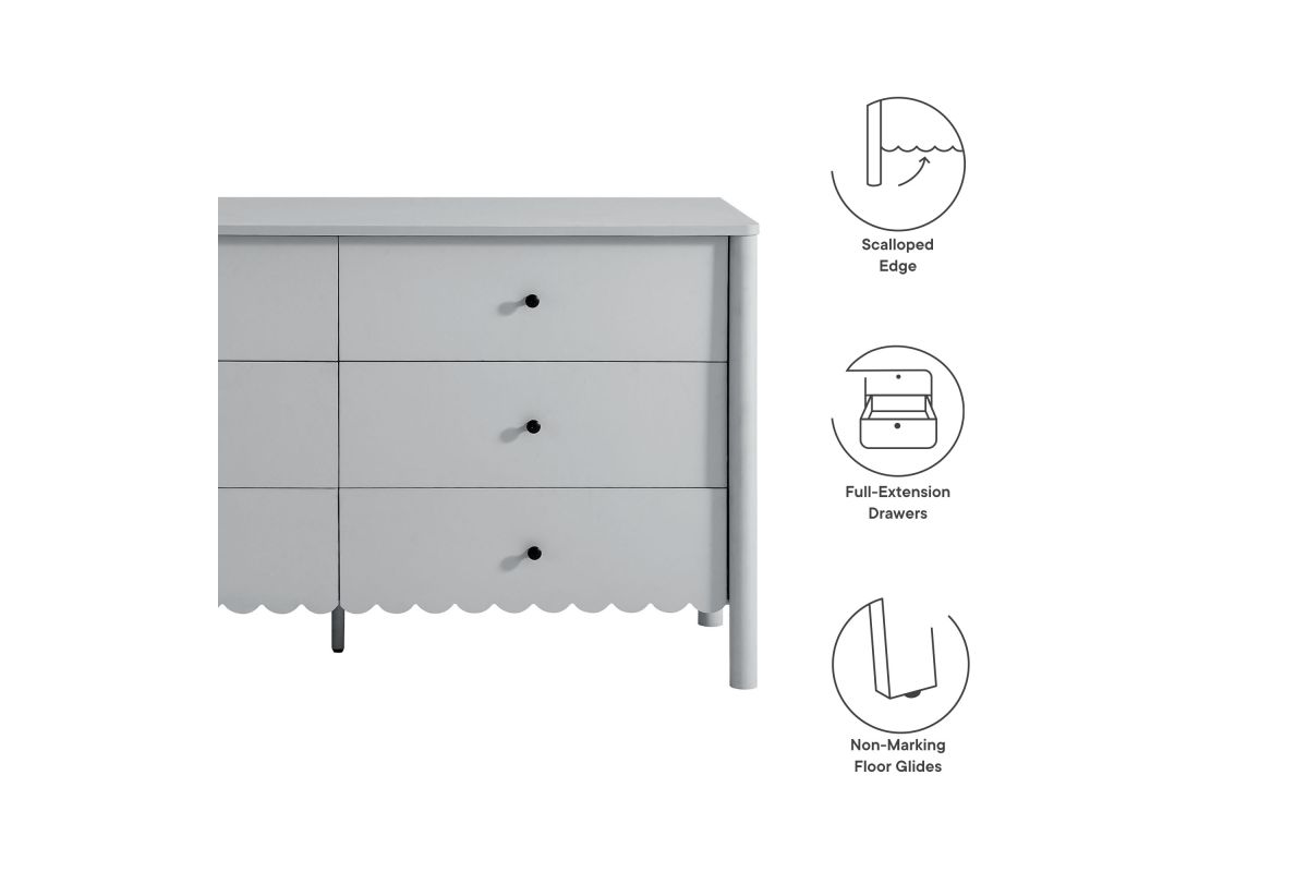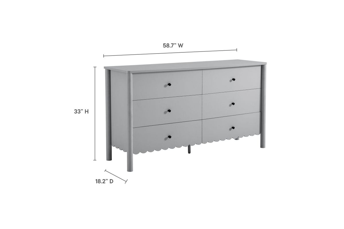 The Emmeline 6-Drawer Dresser blends modern elegance with practical storage, bringing artistic flair to your bedroom or living room. Featuring a signature scalloped edge, this wavy double dresser adds a soft, flowing silhouette to any space. With six spacious full-glide drawers, the dresser offers ample storage for organizing clothing, bedroom essentials, linens, or even media accessories when used as a TV stand for a wall-mounted TV. Crafted with a sturdy frame and finished in smooth laminate, this versatile dresser brings both function and style to your home. The round drawer knobs and non-marking glides enhance its refined appearance while ensuring your floors stay protected. Whether used in a girls' bedroom, a modern living room, or as an organizer in the hallway, the Emmeline 6-Drawer Dresser provides an elegant storage solution. Assembly required.