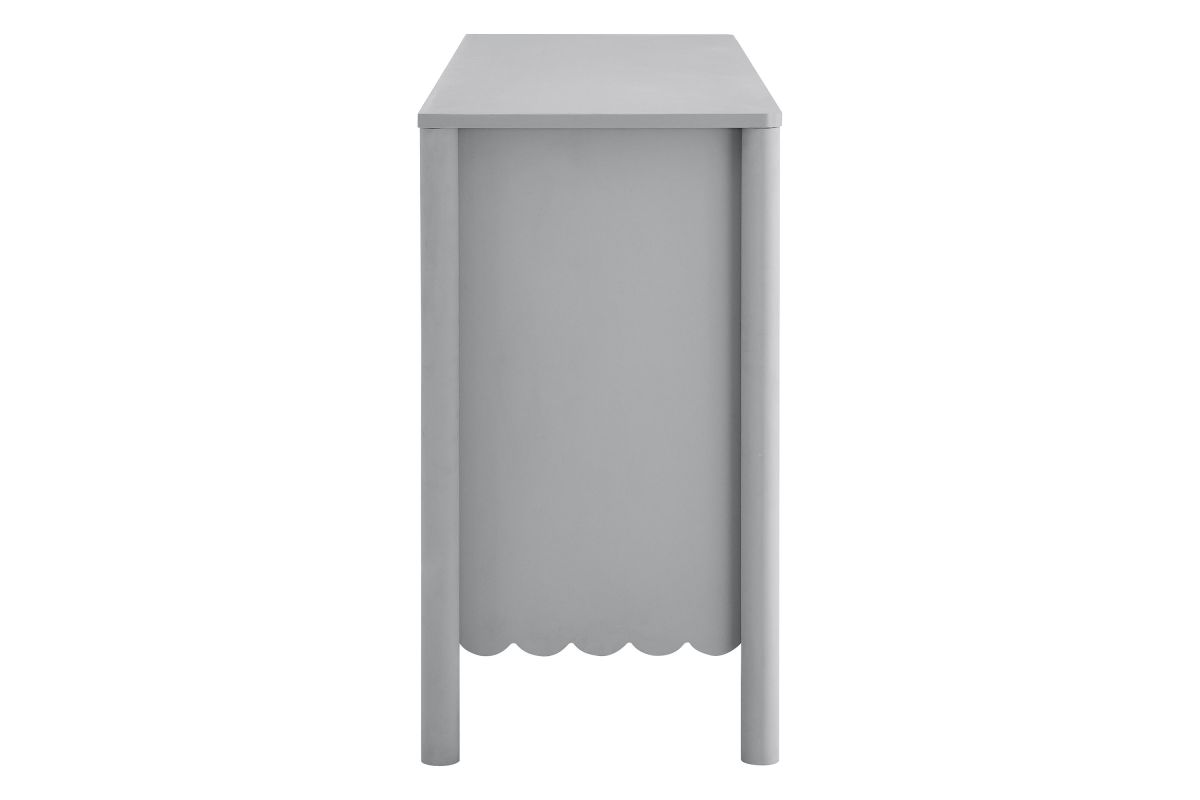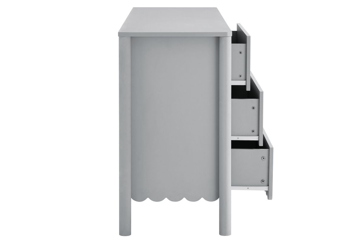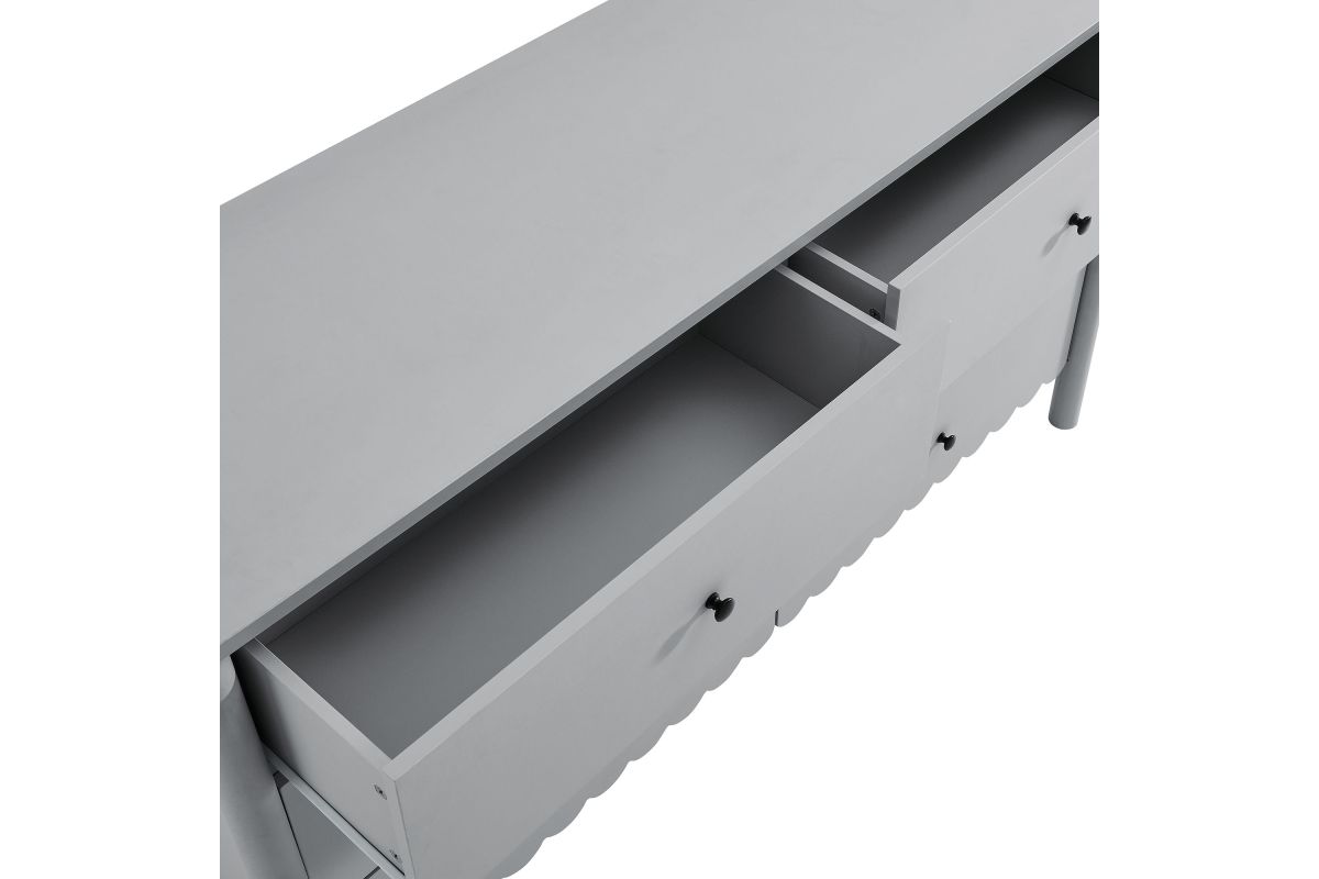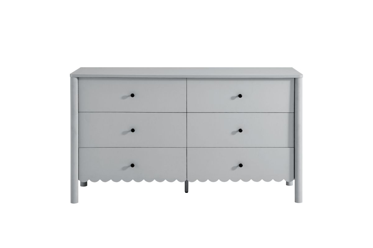 The Emmeline 6-Drawer Dresser blends modern elegance with practical storage, bringing artistic flair to your bedroom or living room. Featuring a signature scalloped edge, this wavy double dresser adds a soft, flowing silhouette to any space. With six spacious full-glide drawers, the dresser offers ample storage for organizing clothing, bedroom essentials, linens, or even media accessories when used as a TV stand for a wall-mounted TV. Crafted with a sturdy frame and finished in smooth laminate, this versatile dresser brings both function and style to your home. The round drawer knobs and non-marking glides enhance its refined appearance while ensuring your floors stay protected. Whether used in a girls' bedroom, a modern living room, or as an organizer in the hallway, the Emmeline 6-Drawer Dresser provides an elegant storage solution. Assembly required.