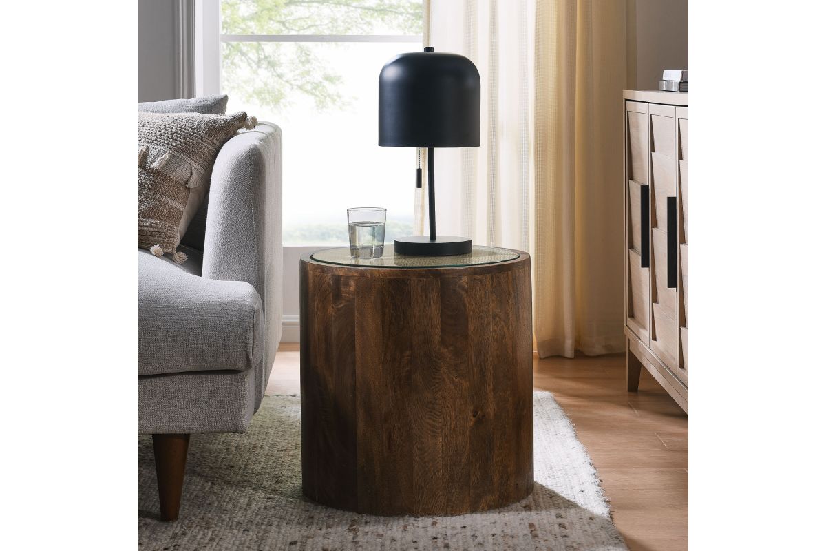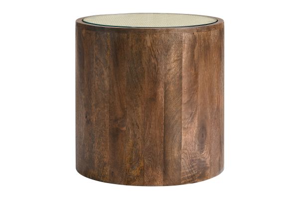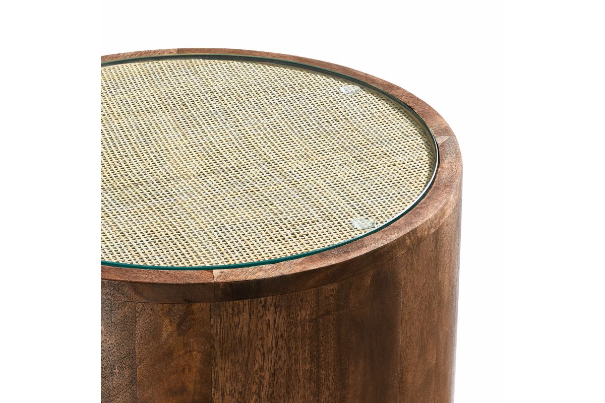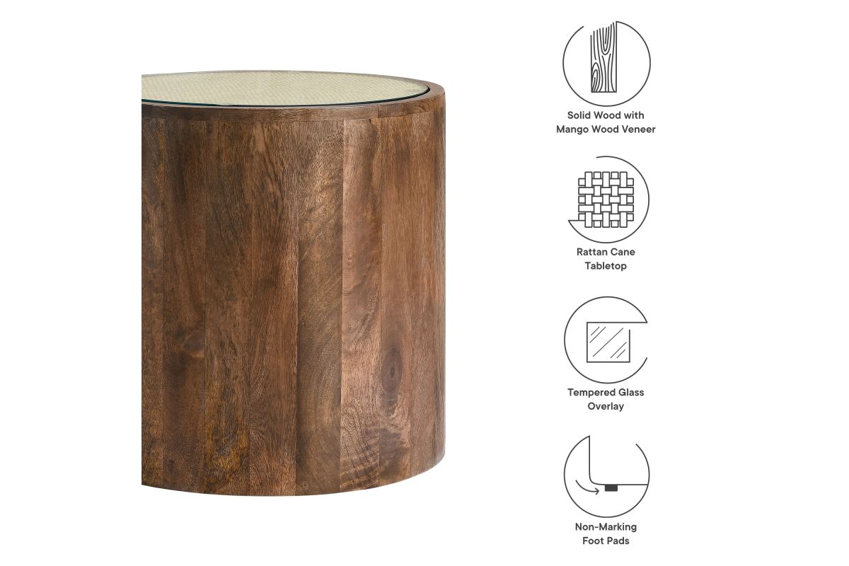 The Truett Round Wood Side Table highlights the beauty of natural wood in a rustic, laid-back design. Crafted from solid wood with a rich mango wood veneer, its cylindrical drum table shape features a rattan cane top beneath a tempered glass overlay, bringing both texture and durability to the design. Its versatile use makes it the perfect small accent table for compact spaces, whether as a plant stand in the hallway or as a round side table in the living room. Designed with non-marking foot pads, the Truett Rattan Cane End Table ensures your floors stay protected while effortlessly adding a natural touch to any room. Arriving fully assembled for immediate use, this wood glass top side table adds both style and practicality to your home. Weight Capacity: 50 lbs.